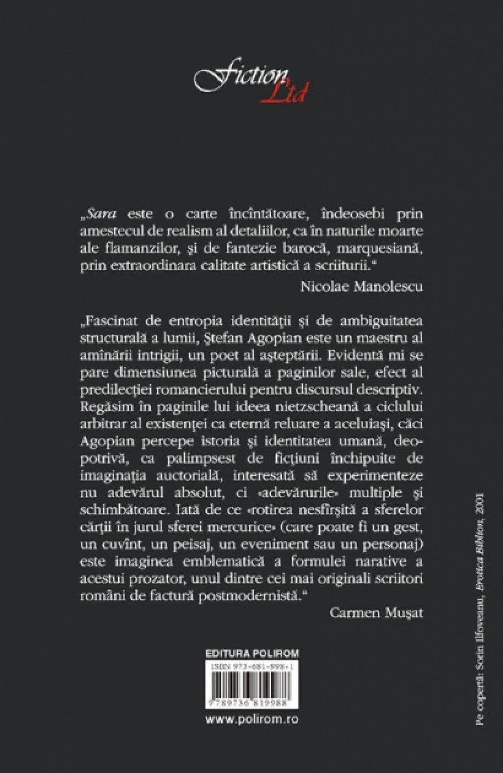 Sara este o carte incintatoare, indeosebi prin amestecul de realism al detaliilor, ca in naturile moarte ale flamanzilor, si de fantezie baroca, marquesiana, prin extraordinara calitate artistica a scriiturii.” (Nicolae Manolescu)
