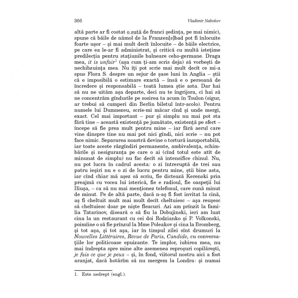 „Aceste scrisori cuprind cele mai emotionante pasaje pe care le va scrie vreodata Nabokov, pline de viziuni cind impresioniste, cind extrem de detaliate asupra lumii inconjuratoare, pe care o zugraveste ca fiind dureros de frumoasa. Nabokov cel din acest volum e un scriitor care isi face o misiune din a-si convinge cititoarea sa coboare de pe terasa de la ultimul etaj aratindu-i splendoarea lumii care a incetat cumva sa mai fie o sursa de incintare.” (The Times Literary Supplement)