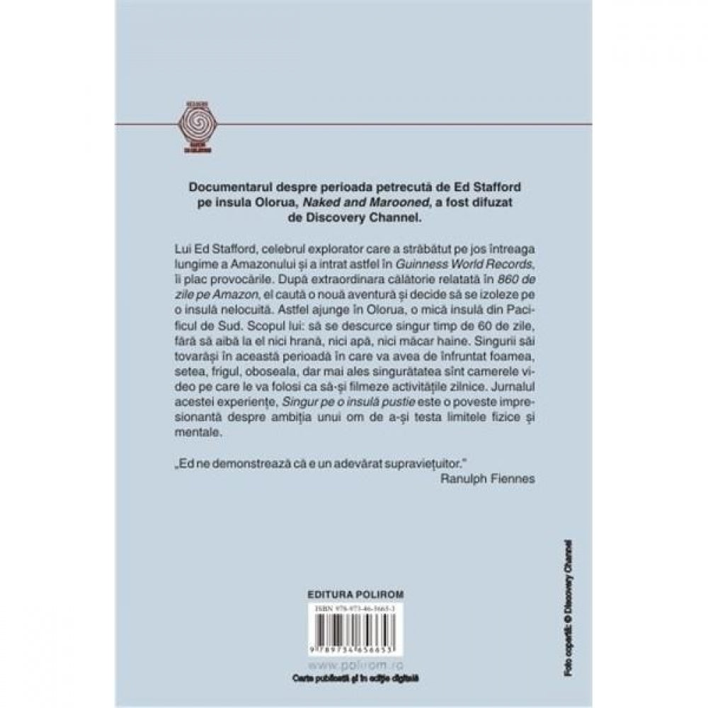 Lui Ed Stafford, celebrul explorator care a strabatut pe jos intreaga lungime a Amazonului si a intrat astfel in Guinness World Records, ii plac provocarile. Dupa extraordinara calatorie relatata in 860 de zile pe Amazon, el cauta o noua aventura si decide sa se izoleze pe o insula nelocuita. Astfel ajunge in Olorua, o mica insula din Pacificul de Sud. Scopul lui: sa se descurce singur timp de 60 de zile, fara sa aiba la el nici hrana, nici apa, nici macar haine. Singurii sai tovarasi in aceasta perioada in care va avea de infruntat foamea, setea, frigul, oboseala, dar mai ales singuratatea sint camerele video pe care le va folosi ca sa-si filmeze activitatile zilnice. Jurnalul acestei experiente, Singur pe o insula pustie este o poveste impresionanta despre ambitia unui om de a-si testa limitele fizice si mentale.