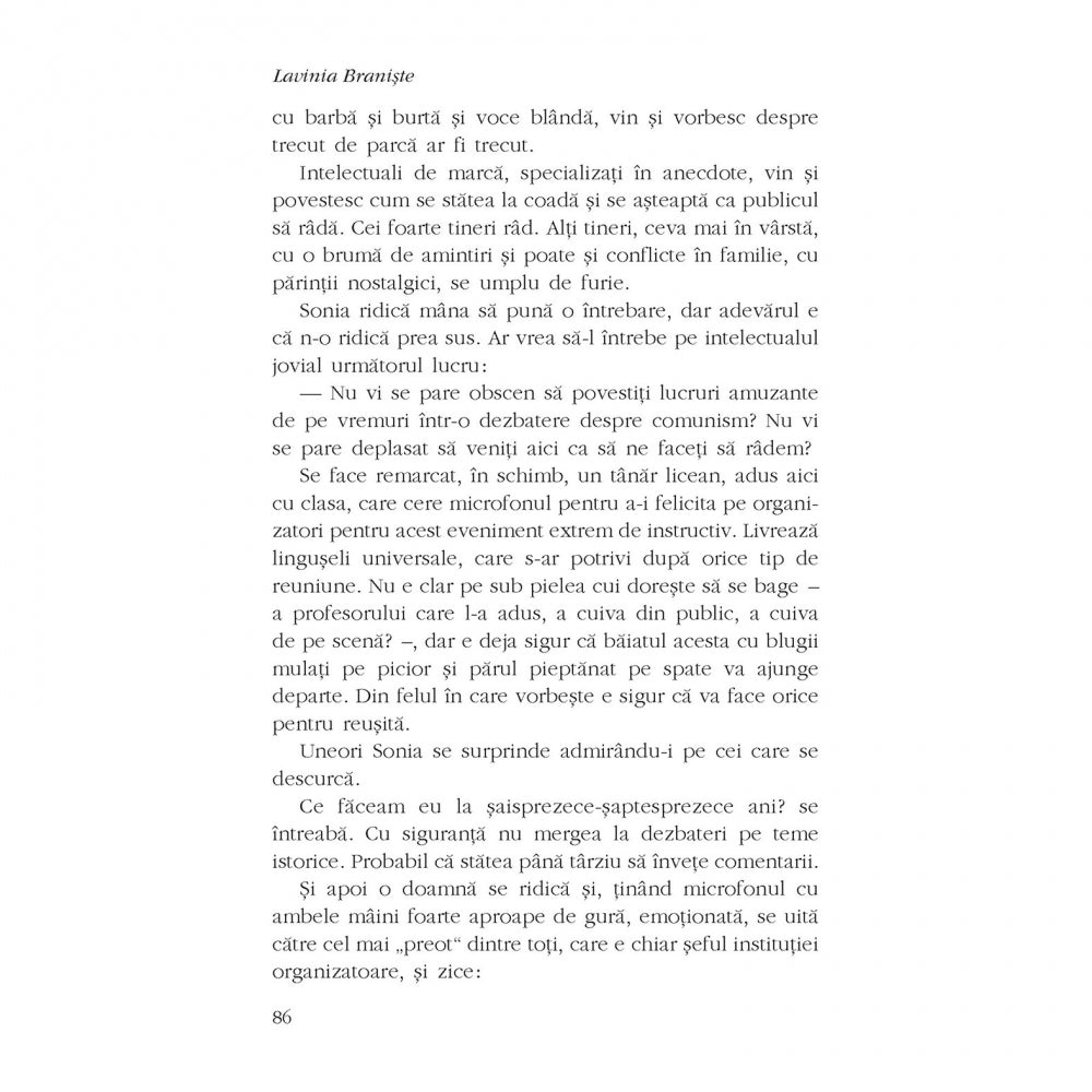 „Lavinia Braniste, nume de virf din noul val, revine cu un roman extraordinar. Cartea exploreaza trecutul comunist plecind de la un scenariu de film despre Zoia Ceausescu, dar investigheaza si labirinturile geografice ale Romaniei – acele zone obscure si ambigue care apar pe harta doar in preajma alegerilor electorale. Sonia ridica mina pleaca in cautarea comunismului pierdut, in cautarea provinciei pierdute, in cautarea familiei pierdute, in cautarea identitatii de gen, in cautarea noilor configuratii sociale din lumea metropolitana de azi. Este un roman melancolic si puternic. Imersiunea lui in trecut provoaca prezentul sa iasa la suprafata.” (Mihai Iovanel)