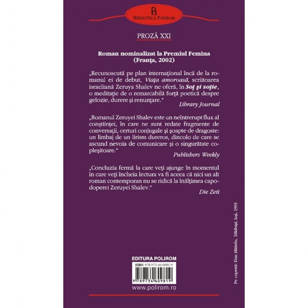 „Recunoscuta pe plan international inca de la romanul ei de debut, Viata amoroasa, scriitoarea israeliana Zeruya Shalev ne ofera, in Sot si sotie, o meditatie de o remarcabila forta poetica despre gelozie, durere si renuntare."(Library Journal)