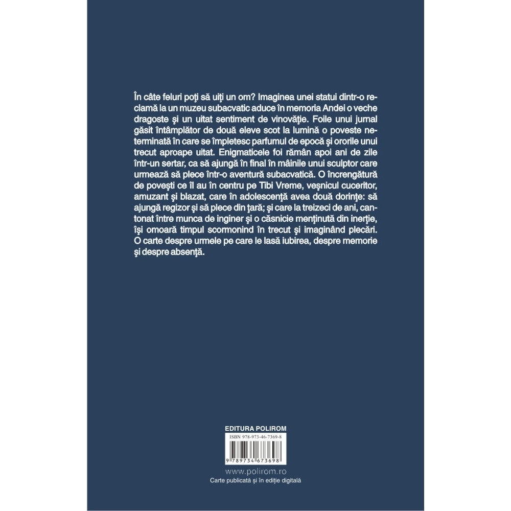 In cite feluri poti sa uiti un om? Imaginea unei statui dintr-o reclama la un muzeu subacvatic aduce in memoria Andei o veche dragoste si un uitat sentiment de vinovatie. Foile unui jurnal gasit intimplator de doua eleve scot la lumina o poveste neterminata in care se impletesc parfumul de epoca si ororile unui trecut aproape uitat. Enigmaticele foi ramin apoi ani de zile intr-un sertar, ca sa ajunga in final in miinile unui sculptor care urmeaza sa plece intr-o aventura subacvatica. O increngatura de povesti ce il au in centru pe Tibi Vreme, vesnicul cuceritor, amuzant si blazat, care in adolescenta avea doua dorinte: sa ajunga regizor si sa plece din tara; si care la treizeci de ani, cantonat intre munca de inginer si o casnicie mentinuta din inertie, isi omoara timpul scormonind in trecut si imaginind plecari.