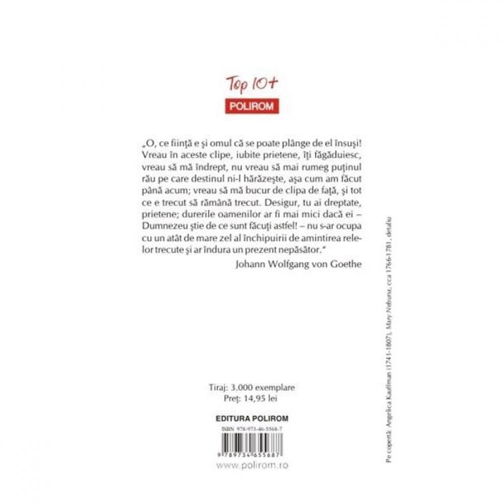 „O, ce fiinta e si omul ca se poate plinge de el insusi! Vreau in aceste clipe, iubite prietene, iti fagaduiesc, vreau sa ma indrept, nu vreau sa mai rumeg putinul rau pe care destinul ni-l harazeste, asa cum am facut pina acum; vreau sa ma bucur de clipa de fata, si tot ce e trecut sa ramina trecut. Desigur, tu ai dreptate, prietene; durerile oamenilor ar fi mai mici daca ei – Dumnezeu stie de ce sint facuti astfel! – nu s-ar ocupa cu un atit de mare zel al inchipuirii de amintirea relelor trecute si ar indura un prezent nepasator.” (Johann Wolfgang von Goethe)