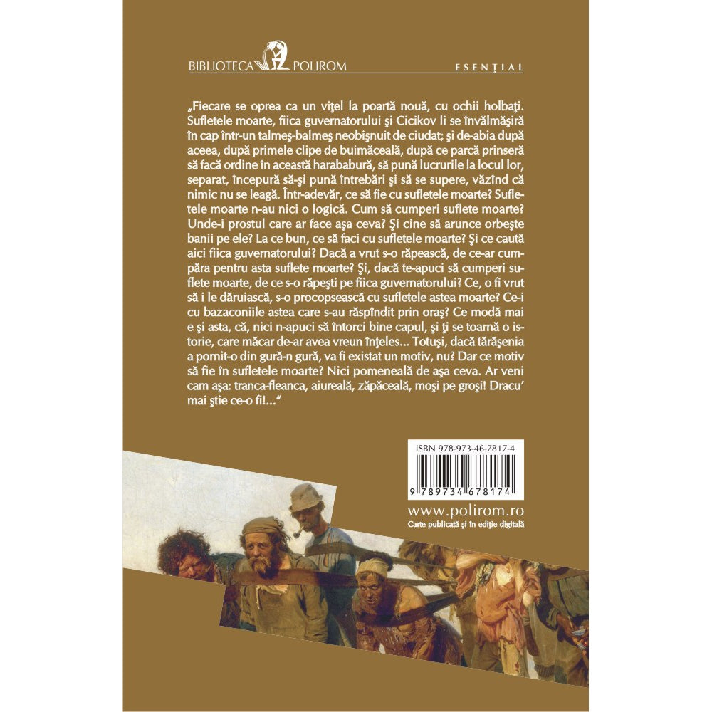 In mijlocul birfelor si al torporii unui orasel obisnuit din Rusia, incremenit in prostie si coruptie, se insinueaza un om onorabil, dornic sa cucereasca inimile noilor sai concetateni. Repede placut de apropiati, agreabil si prietenos, scopurile lui sint, in aparenta, celebritatea si bogatia. Curind, cine ajunge sa-l cunoasca va descoperi ca personajul cu pricina, Cicikov, are o pasiune stranie: el nu umbla prin lume pentru a-i tezauriza bunurile, ci cauta rabdator o marfa aparte – suflete moarte. O poveste despre sufletul rus prins in patimi vechi si in latul neputintei si al coruptiei, Suflete moarte este poemul pierzaniei perpetue al fiintei care-si da friu disperarii si-si gaseste mingiierea in intelepciunea strigata taraganat, dramatic: „Unde-i acela care, in limba materna a sufletului nostru rus, s-ar pricepe sa rosteasca acest cuvint atotputernic: Inainte!? Unde-i acela care, cunoscind toate fortele si insusirile si intreaga adincime a firii noastre, printr-o singura fluturare ademenitoare si plina de vraja a miinii, ar putea sa ne faca sa ne luam avint catre o viata superioara? Cu ce lacrimi, cu ce iubire l-ar rasplati rusul recunoscator! Dar veacurile trec dupa veacuri si o jumatate de milion de trintori, de lalii si de malaieti dorm bustean; rareori se naste in Rusia un barbat care stie sa rosteasca acest cuvint atotputernic!”
