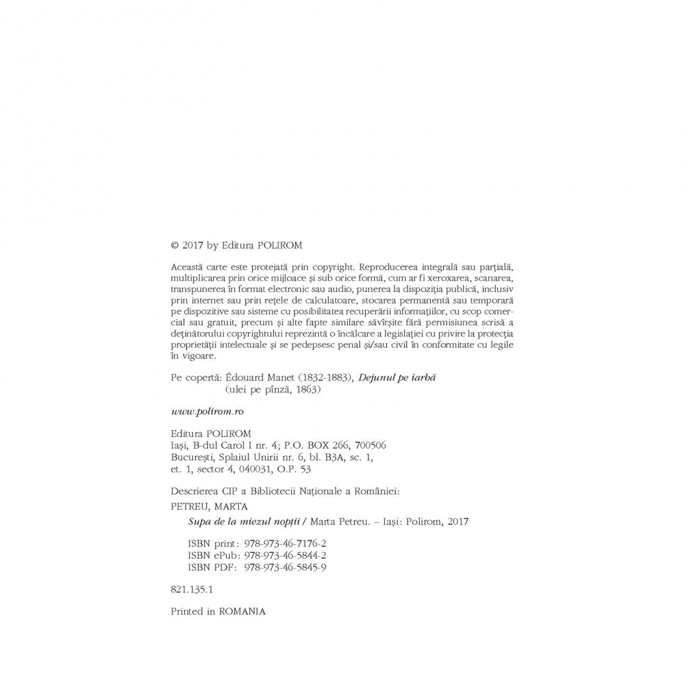 „Viata, in acest roman, se traieste intre brutalitate si suferinta – rarele momente de dragoste aduc o bucurie impalidata. Naratiunea, ce migreaza de la o voce la alta – verosimil si convingator –, e intretaiata de o precizie poetica inimitabila, de o vibratie de rara puritate. Supa de la miezul noptii este un roman tulburat de originalitatea tragica a felului cum destinele personajelor se intersecteaza si, in cele din urma, se distrug. Intre tragicul moment al ultimei supe si placerea dejunului pe iarba se strecoara, din adincuri, stralucirea de argint viu a ironiei. Caci asa se intimpla uneori in viata literaturii: ironia sublimeaza tragicul. Oare si inversul e posibil, e verosimil? ne putem intreba, la sfirsitul lecturii...” (Gelu Ionescu)