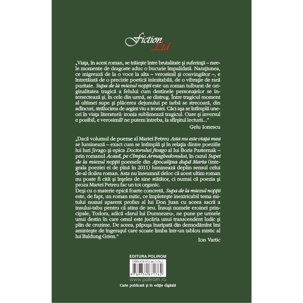 „Daca volumul de poeme al Martei Petreu Asta nu este viata mea se lumineaza – exact cum se intimpla si in relatia dintre poeziile lui Iuri Jivago si epica Doctorului Jivago al lui Boris Pasternak – prin romanul Acasa, pe Cimpia Armaghedonului, in cazul Supei de la miezul noptii poemele din Apocalipsa dupa Marta (integrala poeziei ei de pina in 2011) lumineaza deplin sensul celui de-al doilea roman. Asta nu inseamna deloc ca acest ultim roman nu poate fi citit si inteles de sine statator, ci numai ca poezia si proza Martei Petreu fac un tot organic.