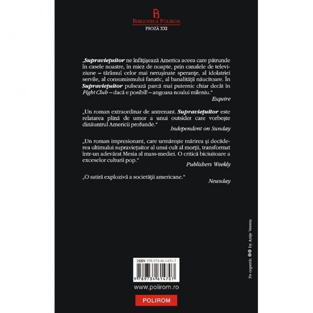 Tender Branson, protagonistul romanului Supravietuitor – ultimul supravietuitor al unei secte religioase denumite Cultul Credinciosilor – isi spune povestea vietii in cutia neagra a Zborului 2039, la 12 000 de metri deasupra Oceanului Pacific. E singur, iar avionul o sa se prabuseasca in curind in desertul australian. Inainte ca acest lucru sa se-ntimple, Tender Branson va reface traseul transformarii sale din copilul ascultator si servitorul umil aflat in asteptarea Izbavirii intr-un adevarat Mesia al mass-mediei, indopat cu steroizi si colagen si inzestrat cu darul previziunii. Nu e un flashback, ci o poveste a autodistrugerii care se desfasoara invers, de la ultima pagina la prima. Plin de suspans, memorabil, Supravietuitor este o satira hipnotica, infricosatoare despre pretul celebritatii intr-o lume aflata in stadiu extrem de alienare.