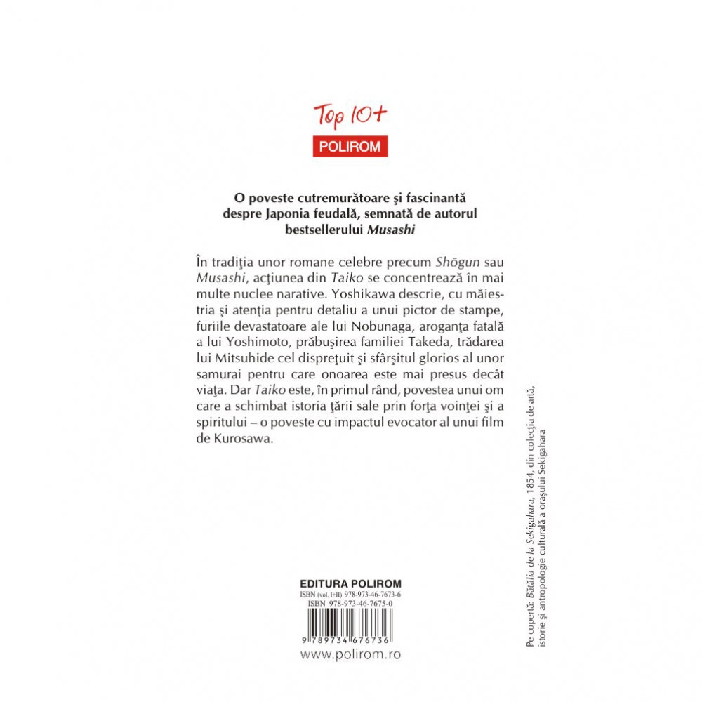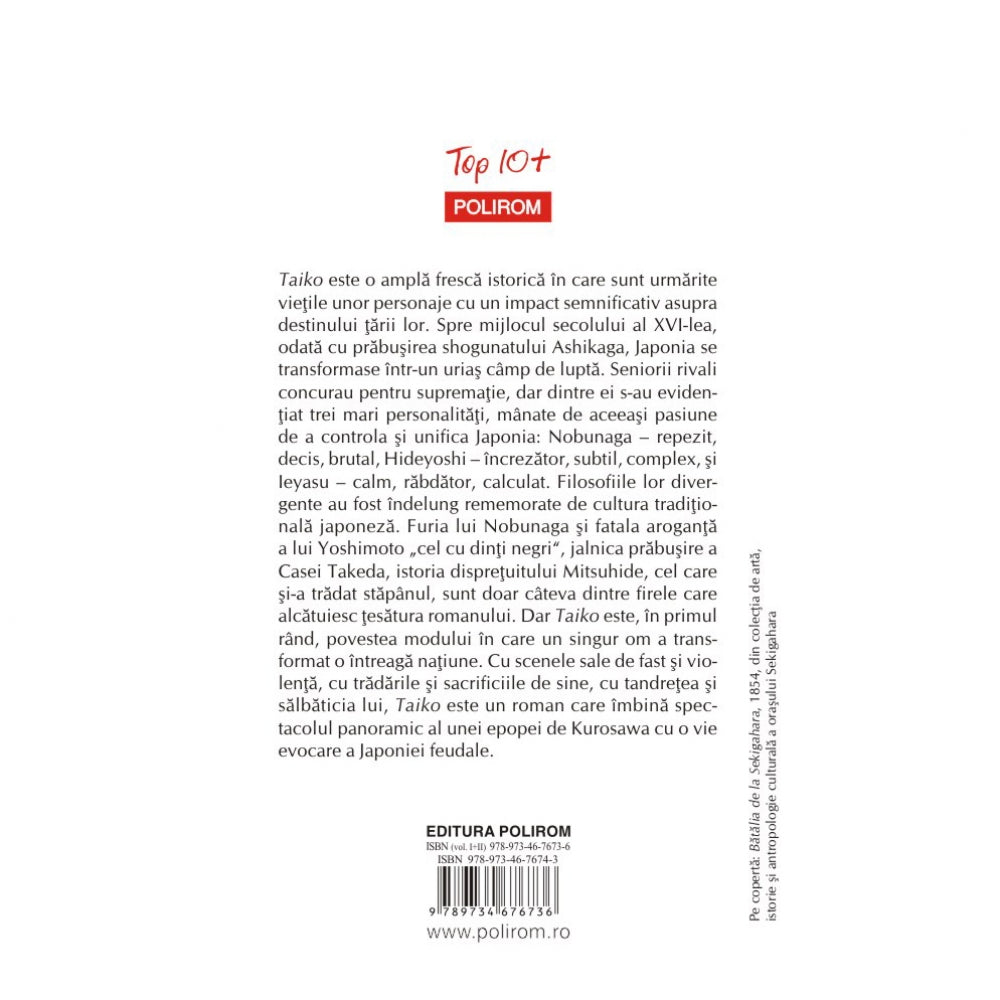 Furia lui Nobunaga si fatala aroganta a lui Yoshimoto „cel cu dinti negri“, jalnica prabusire a Casei Takeda, istoria dispretuitului Mitsuhide, cel care si-a tradat stapinul, sint doar citeva dintre firele care alcatuiesc tesatura romanului. Dar Taiko este, in primul rind, povestea modului in care un singur om a transformat o intreaga natiune. Cu scenele sale de fast si violenta, cu tradarile si sacrificiile de sine, cu tandretea si salbaticia lui, Taiko este un roman care imbina spectacolul panoramic al unei epopei de Kurosawa cu o vie evocare a Japoniei feudale.