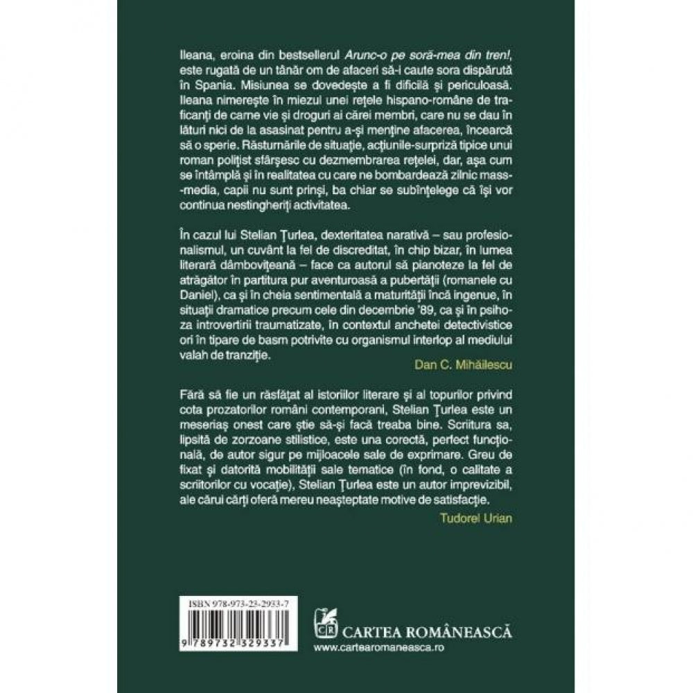 Ileana, eroina din bestsellerul Arunc-o pe sora-mea din tren!, este rugata de un tinar om de afaceri sa-i caute sora disparuta in Spania. Misiunea se dovedeste a fi dificila si periculoasa. Ileana nimereste in miezul unei retele hispano-romane de traficanti de carne vie si droguri ai carei membri, care nu se dau in laturi nici de la asasinat pentru a-si mentine afacerea, incearca sa o sperie. Rasturnarile de situatie, actiunile-surpriza tipice unui roman politist sfirsesc cu dezmembrarea retelei, dar, asa cum se intimpla si in realitatea cu care ne bombardeaza zilnic mass-media, capii nu sint prinsi, ba chiar se subintelege ca isi vor continua nestingheriti activitatea.