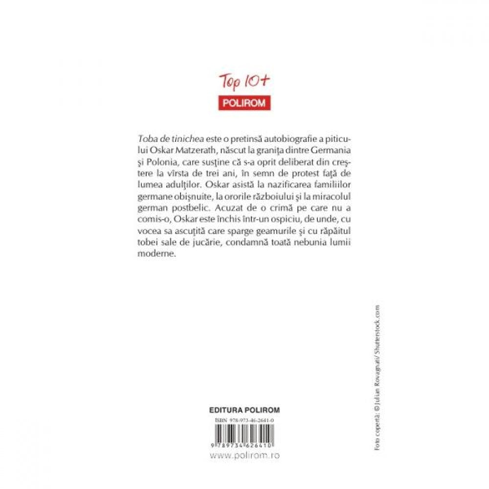 Toba de tinichea este o pretinsa autobiografie a piticului Oskar Matzerath, nascut la granita dintre Germania si Polonia, care sustine ca s-a oprit deliberat din crestere la virsta de trei ani, in semn de protest fata de lumea adultilor. Oskar asista la nazificarea familiilor germane obisnuite, la ororile razboiului si la miracolul german postbelic. Acuzat de o crima pe care nu a comis-o, Oskar este inchis intr-un ospiciu, de unde, cu vocea sa ascutita care sparge geamurile si cu rapaitul tobei sale de jucarie, condamna toata nebunia lumii moderne.