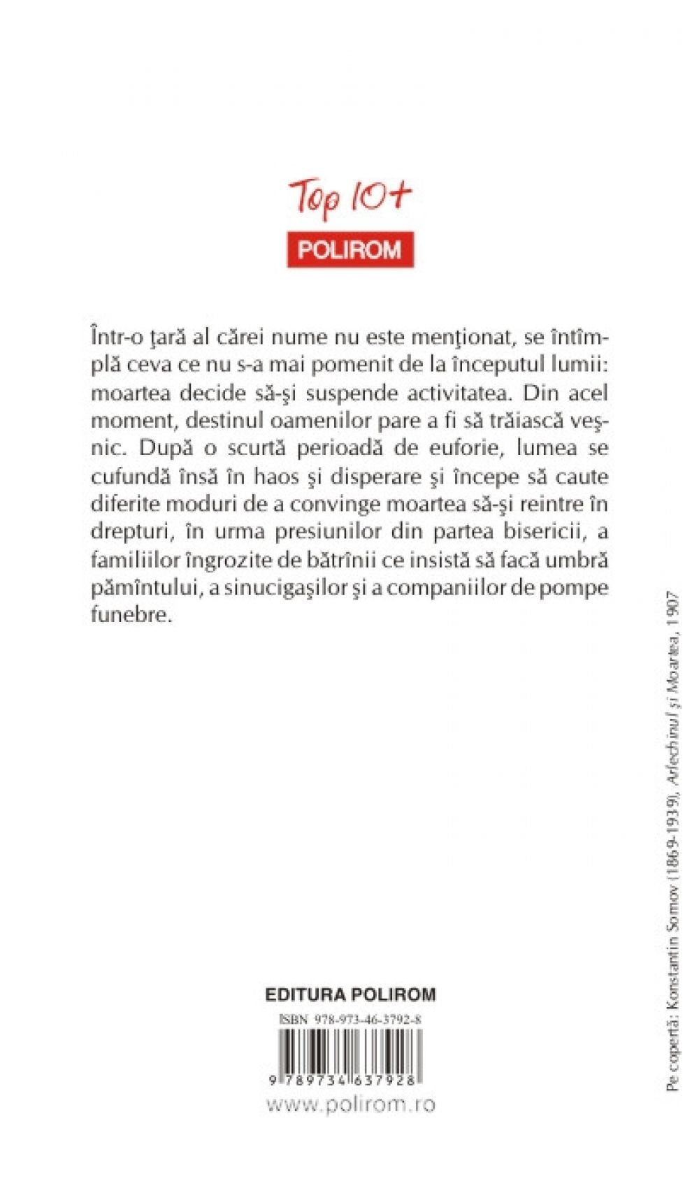 Intr-o tara al carei nume nu este mentionat, se intimpla ceva ce nu s-a mai pomenit de la inceputul lumii: moartea decide sa-si suspende activitatea. Din acel moment, destinul oamenilor pare a fi sa traiasca vesnic. Dupa o scurta perioada de euforie, lumea se cufunda insa in haos si disperare si incepe sa caute diferite moduri de a convinge moartea sa-si reintre in drepturi, in urma presiunilor din partea bisericii, a familiilor ingrozite de batrinii ce insista sa faca umbra pamintului, a sinucigasilor si a companiilor de pompe funebre.