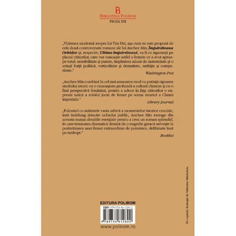 Conceput ca o continuare a povestilor fascinante descrise inImparateasa Orhideesi a intrigilor infiripate in misteriosulOras Interzis, acest ultim roman semnat de Anchee Min duce pina la capat reinterpretarea din perspectiva moderna a vietii tumultuoase a ultimei si celei mai controversate imparatese din istoria Chinei.Ultima imparateasaeste de fapt povestea dramatica a transformarii Orhideei dintr-o tinara puternica si increzatoare intr-o conducatoare abila, capabila sa tina friiele unui imperiu in declin, o poveste in care dramele personale din palatele tainice aleOrasului Interzisdevin pe nesimtite tragediile istorice ale unui intreg popor. Confruntata cu necesitatea de a-si asuma o dubla regenta, cu pierderea prematura a doi fii, cu pasiuni amoroase reprimate pina in ultima clipa a vietii, cu invazia Marilor Puteri si ingenuncherea morala si economica a Chinei, imparateasa Tzu Hsi se dovedeste, in viziunea lui Anchee Min, o femeie capabila sa sacrifice totul in numele adevarului si al dreptatii, dezmintind profetia conform careia „China va fi distrusa de catre o femeie”.