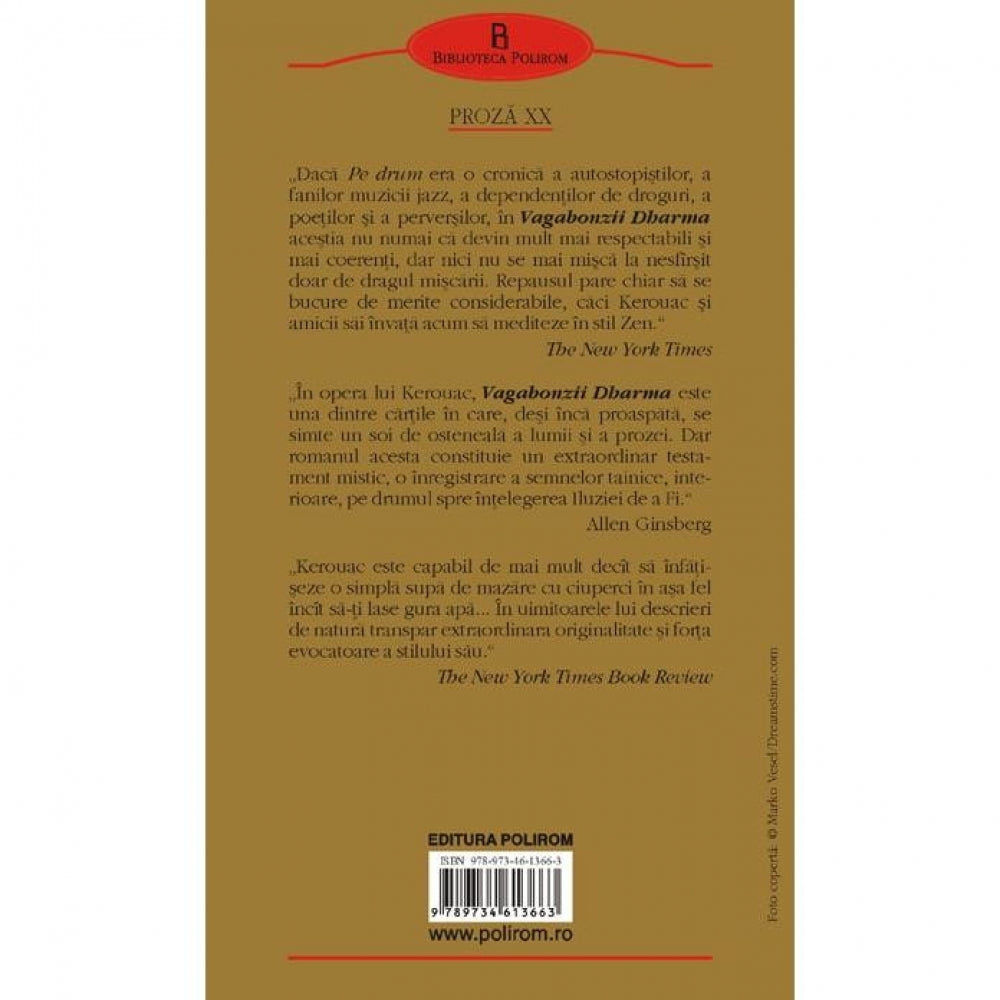 Ca si Pe drum, Vagabonzii Dharma este un roman autobiografic, ce descrie o perioada de cautari spirituale intense din viata lui Kerouac. Sub numele fictive se ascund identitatile multor prieteni ai scriitorului, printre care se numara poetii Gary Snyder si Allen Ginsberg si prozatorul Neal Cassady. Kerouac insusi este Ray Smith, un tinar care isi cauta refugiul in budism, sub indrumarea unui „maestru” zen charismatic, Japhy Ryder (Gary Snyder), iar contrastul dintre conceptiile despre spiritualitate ale celor doi reprezinta principala tema a romanului. Japhy Ryder este un budist excentric si flegmatic, care compune haikuuri, organizeaza ceremonii ale ceaiului si face sex tantric cu femei frumoase. Ray Smith are principii mult mai stricte: in viziunea lui, viata este o lupta necontenita si inversunata intre dorinte lumesti si puritate. Intensitatea conflictului interior este redata in stilul plastic si spontan propriu lui Kerouac, totul culminind cu o calatorie simbolica, de cucerire a unui virf de munte.