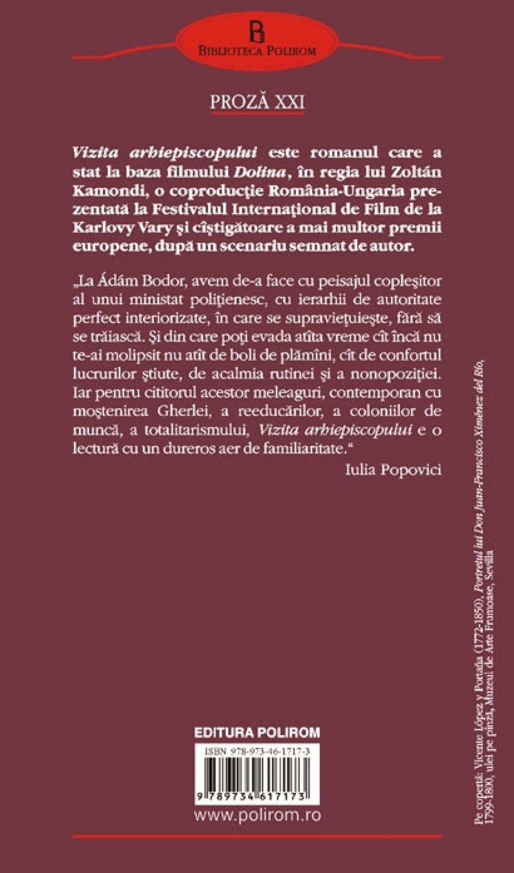 „La Ádám Bodor, avem de-a face cu peisajul coplesitor al unui ministat politienesc, cu ierarhii de autoritate perfect interiorizate, in care se supravietuieste, fara sa se traiasca. Si din care poti evada atita vreme cit inca nu te-ai molipsit nu atit de boli de plamini, cit de confortul lucrurilor stiute, de acalmia rutinei si a nonopozitiei. Iar pentru cititorul acestor meleaguri, contemporan cu mostenirea Gherlei, a reeducarilor, a coloniilor de munca, a totalitarismului, Vizita arhiepiscopului e o lectura cu un dureros aer de familiaritate.” (Iulia Popovici)