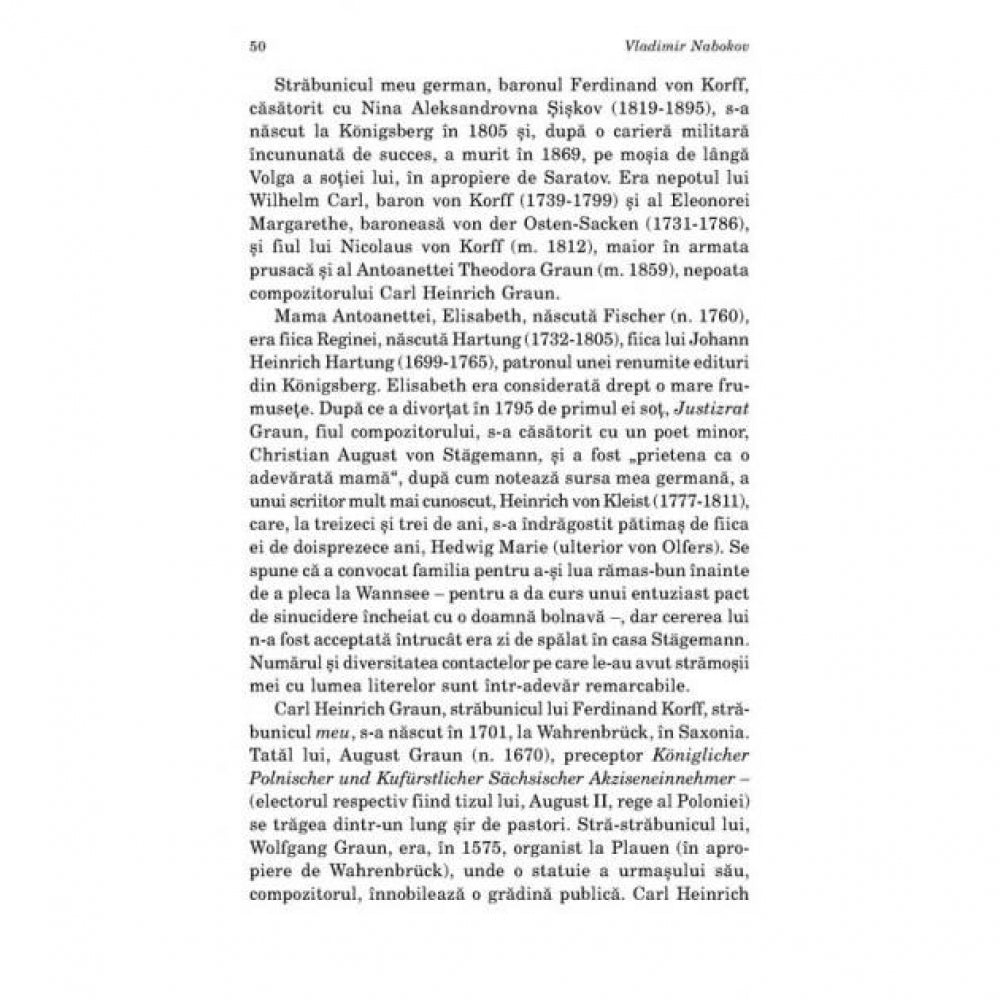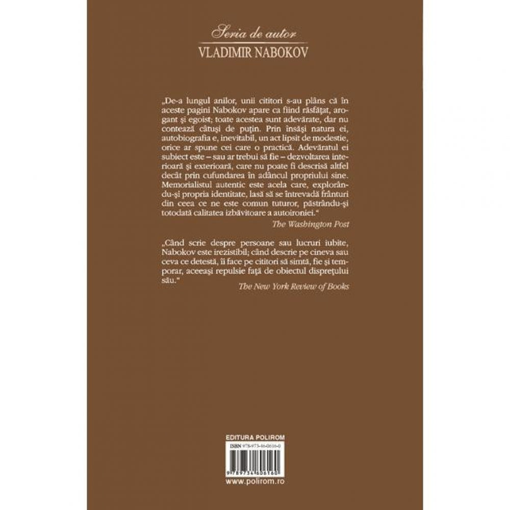 „De-a lungul anilor, unii cititori s-au plins ca in aceste pagini Nabokov apare ca fiind rasfatat, arogant si egoist; toate acestea sint adevarate, dar nu conteaza citusi de putin. Prin insasi natura ei, autobiografia e, inevitabil, un act lipsit de modestie, orice ar spune cei care o practica. Adevaratul ei subiect este – sau ar trebui sa fie – dezvoltarea interioara si exterioara, care nu poate fi descrisa altfel decit prin cufundarea in adincul propriului sine. Memorialistul autentic este acela care, explorindu-si propria identitate, lasa sa se intrevada frinturi din ceea ce ne este comun tuturor, pastrindu-si totodata calitatea izbavitoare a autoironiei.”(The Washington Post)