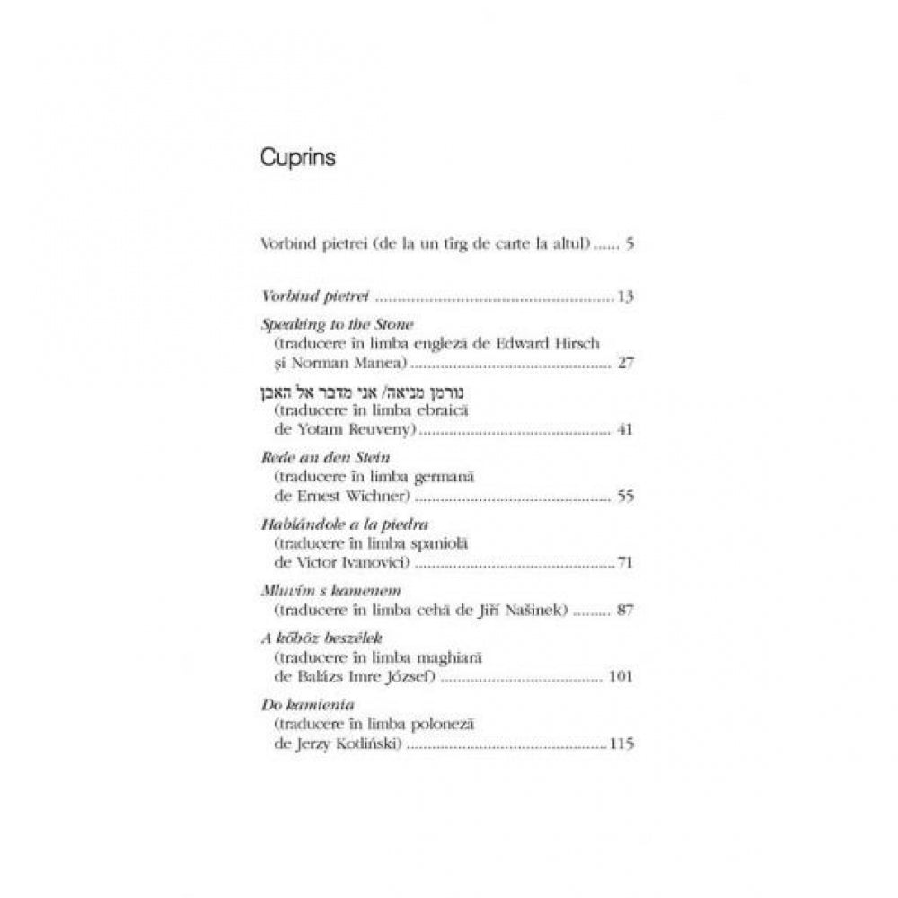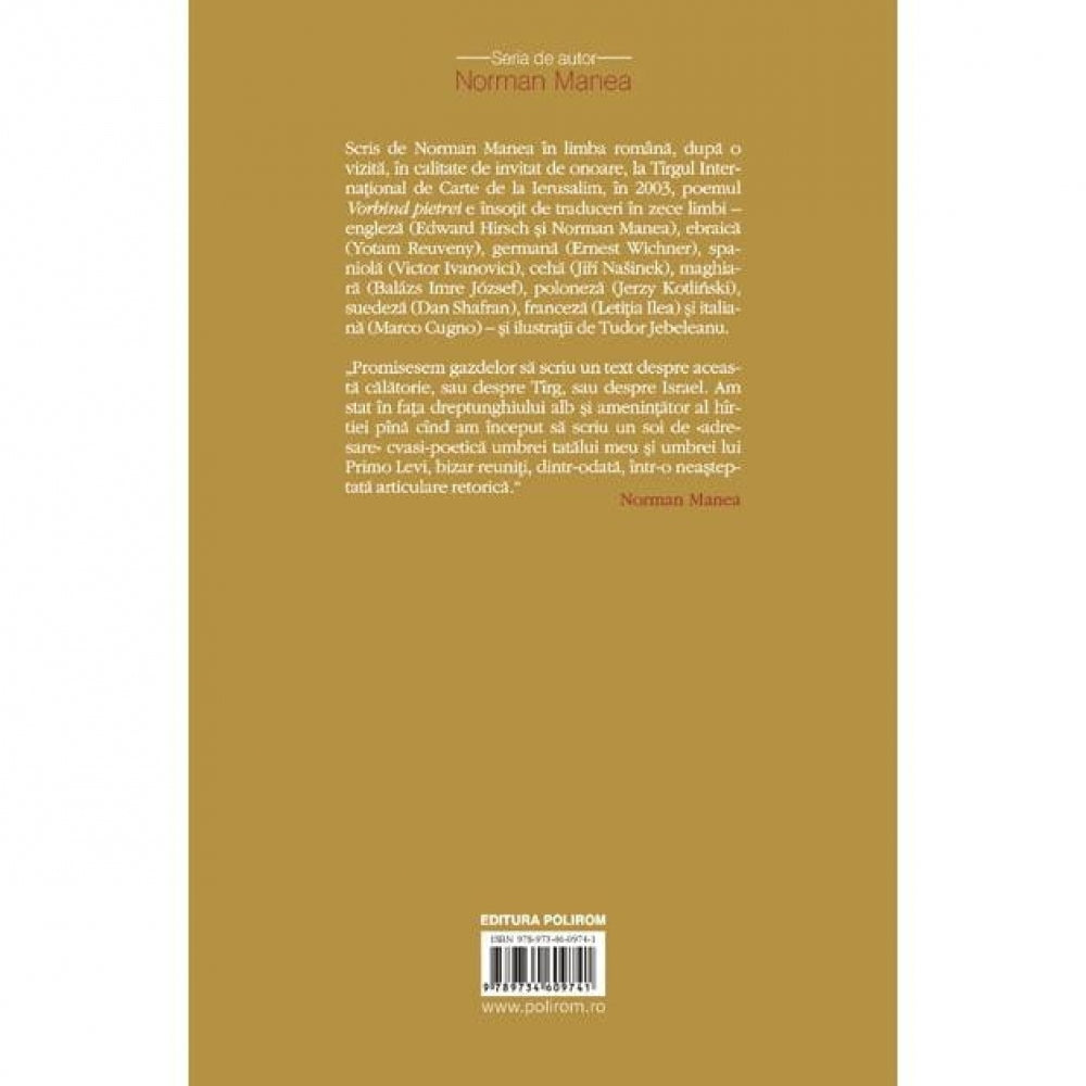 Scris de Norman Manea in limba romana, dupa o vizita, in calitate de invitat de onoare, la Tirgul de Carte de la Ierusalim, in 2003, poemul „Vorbind pietrei” e insotit de traduceri in zece limbi: engleza (Edward Hirsch si Norman Manea), ebraica (Yotam Reuveni), germana (Ernest Wichner), spaniola (Victor Ivanovici), ceha (Jiri Nasinek), maghiara (Balazs Imre Jozsef), poloneza (Jerzy Kotlinski), suedeza (Dan Shafran), franceza (Letitia Ilea) si italiana (Marco Cugno).