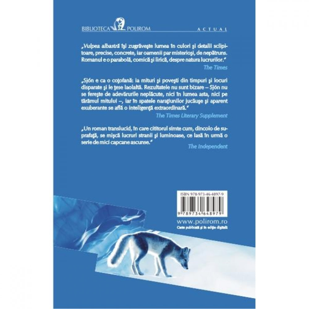 Anul 1883, Islanda. Cu putin timp inaintea noptii polare, un barbat, pastorul Baldur Skuggason, este atras ca prin farmec de o vulpe albastra in pustietatea inghetata. Destinul sau se va intersecta cu cel al botanistului Friðrik B. Friðjonsson, care se pregateste sa inmorminteze o tinara bolnava de sindromul Down, salvata cu ani in urma dintr-un naufragiu. Din povestile aparent disparate ale personajelor se intrupeaza un roman deopotriva misterios si poetic, o parabola despre creatie si sacrificiu, un basm intunecat in care umorul si lirismul se impletesc stralucit, confirmind talentul literar al unui scriitor de talie internationala. Romanul Vulpea albastra a fost laureat cu Premiul pentru literatura acordat de Consiliul Nordic, cea mai inalta distinctie literara nord -europeana.