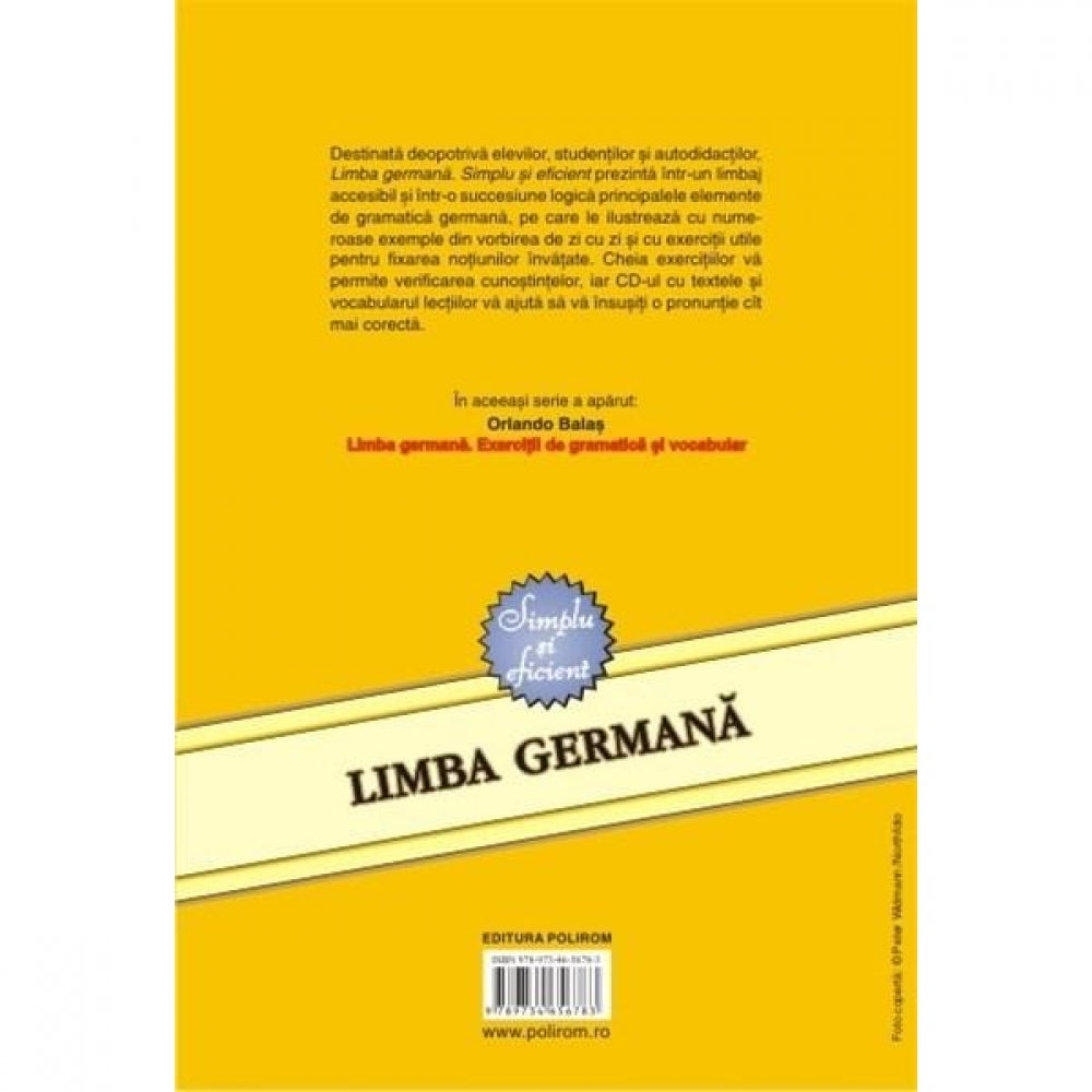 Destinata deopotriva elevilor, studentilor si autodidactilor, Limba germana. Simplu si eficient prezinta intr-un limbaj accesibil si intr-o succesiune logica principalele elemente de gramatica germana, pe care le ilustreaza cu numeroase exemple din vorbirea de zi cu zi si cu exercitii utile pentru fixarea notiunilor invatate. Cheia exercitiilor va permite verificarea cunostintelor, iar CD-ul cu textele si vocabularul lectiilor va ajuta sa va insusiti o pronuntie cit mai corecta.