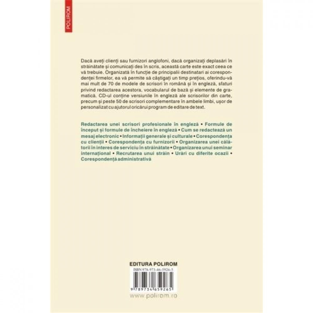 Daca aveti clienti sau furnizori anglofoni, daca organizati deplasari in strainatate si comunicati des in scris, aceasta carte este exact ceea ce va trebuie. Organizata in functie de principalii destinatari ai corespondentei firmelor, ea va permite sa cistigati un timp pretios, oferindu-va mai mult de 70 de modele de scrisori in romana si in engleza, sfaturi privind redactarea acestora, vocabularul de baza si elemente de gramatica. CD-ul contine versiunile in engleza ale scrisorilor din carte, precum si peste 50 de scrisori complementare in ambele limbi, usor de personalizat cu ajutorul oricarui program de editare de text.