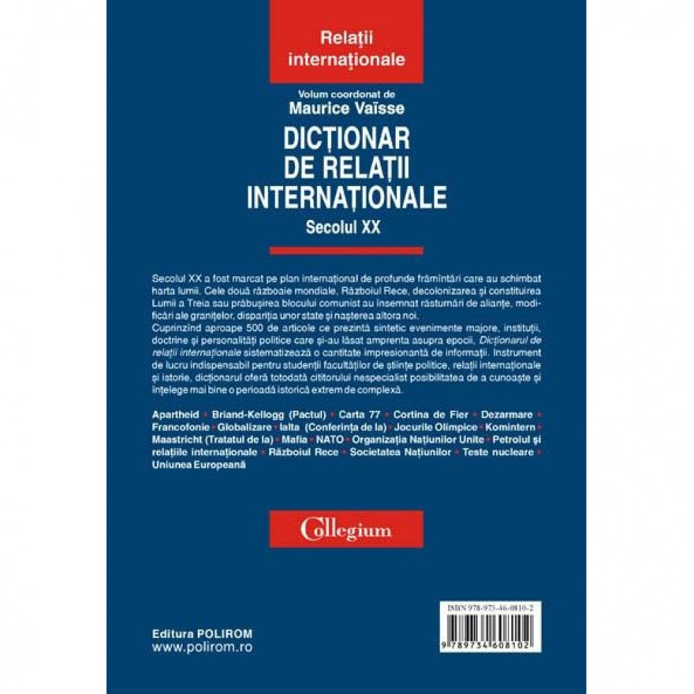 Cuprinzind aproape 500 de articole ce prezinta sintetic evenimente majore, institutii, doctrine si personalitati politice care si-au lasat amprenta asupra epocii, Dictionarul de relatii internationale sistematizeaza o cantitate impresionanta de informatii. Instrument de lucru indispensabil pentru studentii facultatilor de istorie, stiinte politice si relatii internationale, dictionarul ofera totodata cititorului nespecialist posibilitatea de a cunoaste si intelege mai bine o perioada istorica extrem de complexa.