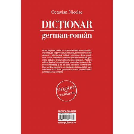 Acest dictionar modern, cu peste 90.000 de cuvinte-titlu, cuprinde, pe linga vocabularul uzual, termeni din diferite domenii —informatica, politica, economie, drept, medicina —care denumesc realitati specifice societatii germane actuale, precum si numeroase expresii. Poate fi utilizat de elevi, studenti (toate nivelurile), profesori, dar si de autodidacti si de cei care activeaza in sfera relatiilor romano-germane, de traducatori si specialisti care colaboreaza cu firme germane sau care isi desfasoara activitatea in Germania.