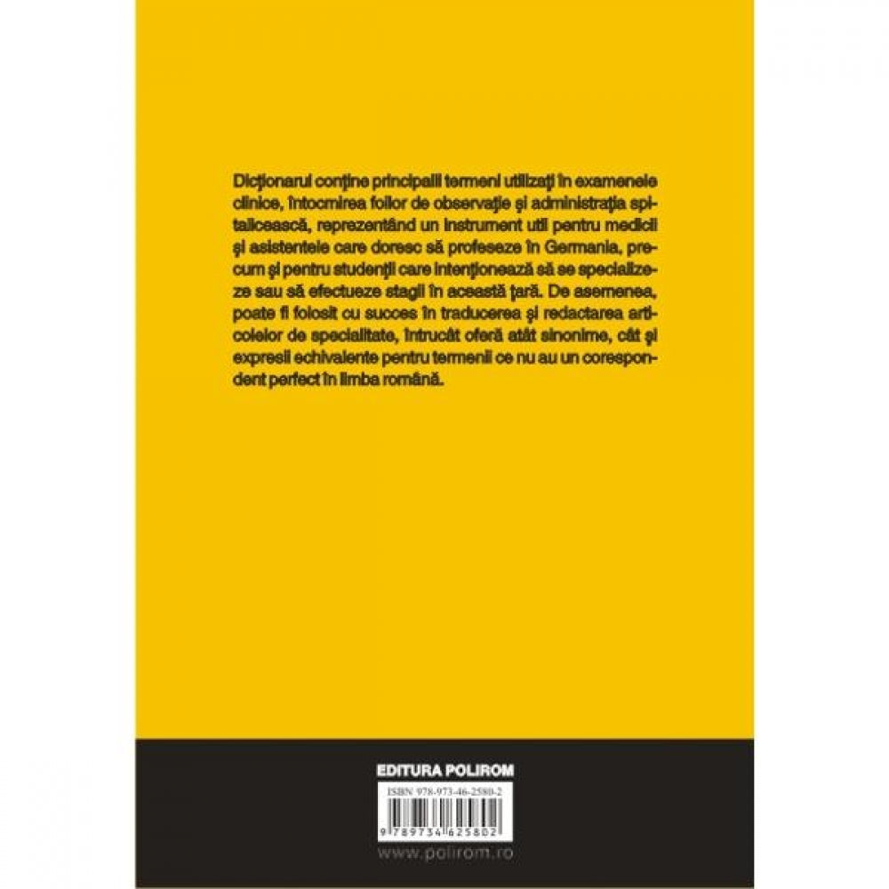 Dictionarul contine principalii termeni utilizati in examenele clinice, intocmirea foilor de observatie si administratia spitaliceasca, reprezentind un instrument util pentru medicii si asistentele care doresc sa profeseze in Germania, precum si pentru studentii care intentioneaza sa se specializeze sau sa efectueze stagii in aceasta tara. De asemenea, poate fi folosit cu succes in traducerea si redactarea articolelor de specialitate, intrucit ofera atit sinonime, cit si expresii echivalente pentru termenii ce nu au un corespondent perfect in limba romana.
