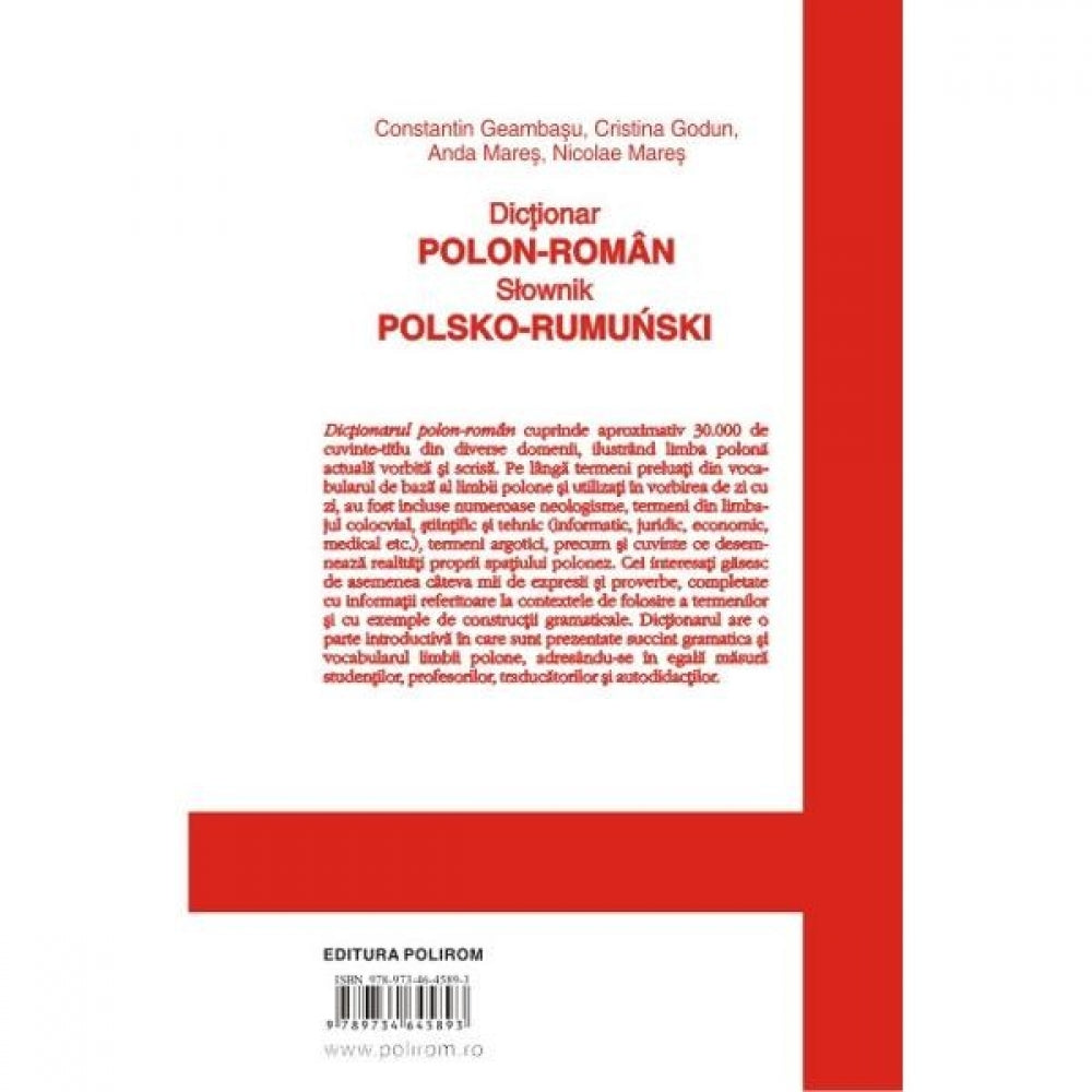 Dictionarul polon-roman cuprinde aproximativ 30.000 de cuvinte-titlu din diverse domenii, ilustrind limba polona actuala vorbita si scrisa. Pe linga termeni preluati din vocabularul de baza al limbii polone si utilizati in vorbirea de zi cu zi, au fost incluse numeroase neologisme, termeni din limbajul colocvial, stiintific si tehnic (informatic, juridic, economic, medical etc.), termeni argotici, precum si cuvinte ce desemneaza realitati proprii spatiului polonez. Cei interesati gasesc de asemenea citeva mii de expresii si proverbe, completate cu informatii referitoare la contextele de folosire a termenilor si cu exemple de constructii gramaticale. Dictionarul are o parte introductiva in care sint prezentate succint gramatica si vocabularul limbii polone, adresindu-se in egala masura studentilor, profesorilor, traducatorilor si autodidactilor.