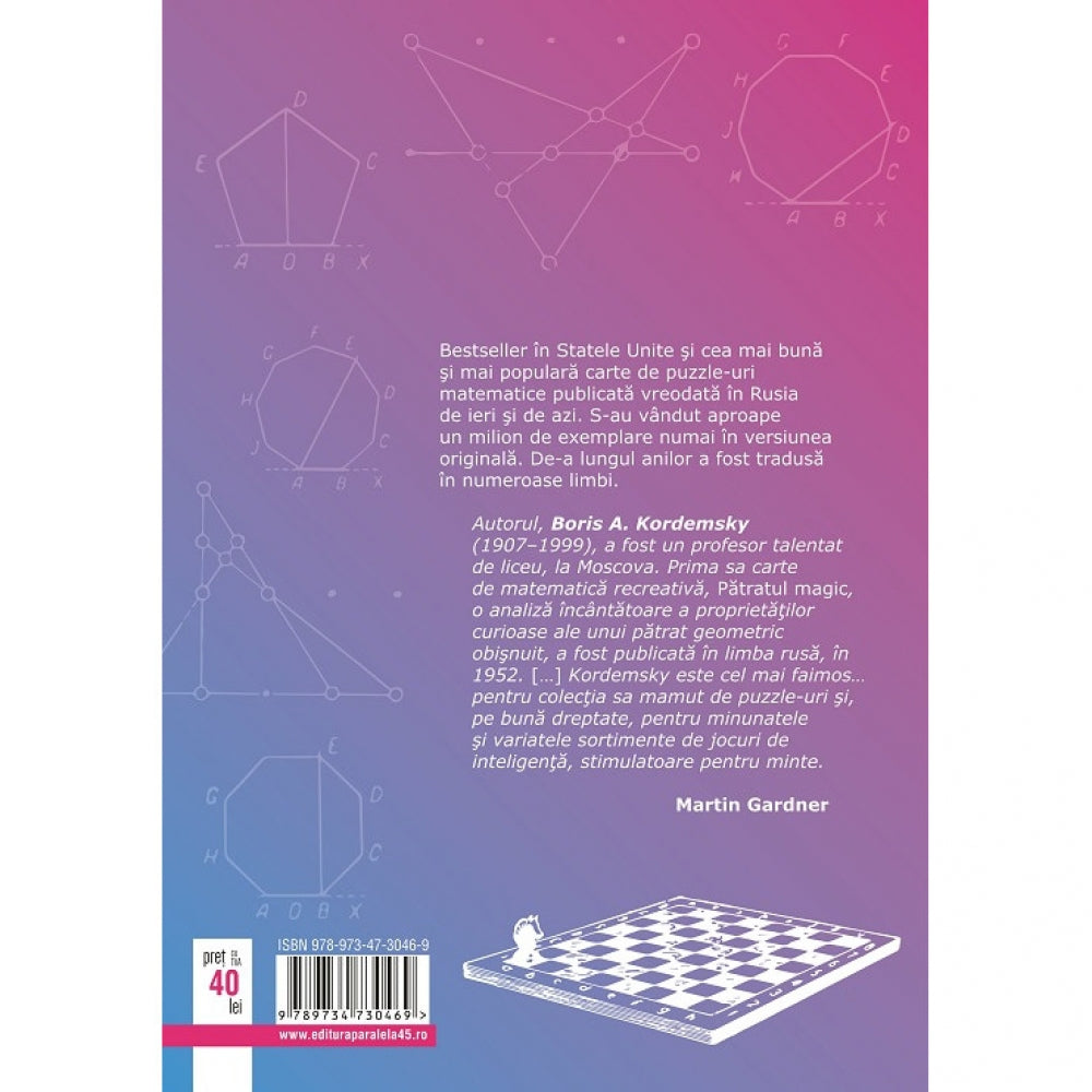 Bestseller in Statele Unite si cea mai buna si mai populara carte de puzzle-uri matematice publicata vreodata in Rusia de ieri si de azi.S-au vandut aproape un milion de exemplare numai in versiunea originala. De-a lungul anilor a fost tradusa in numeroase limbi.Autorul, Boris A. Kordemski (1907-1999), a fost un profesor talentat de liceu, la Moscova. Prima sa carte de matematica recreativa, Patratul magic, o analiza incantatoare a proprietatilor curioase ale unui patrat geometric obisnuit, a fost publicata in limba rusa, in 1952. […] Kordemski este cel mai faimos… pentru colectia sa mamut de puzzle-uri si, pe buna dreptate, pentru minunatele si variatele sortimente de jocuri de inteligenta, stimulatoare pentru minte.Martin GardnerPrefata: Martin GardnerTraducatori: Leonard Giugiuc, Diana-Veronica Gogan-Trailescu, Claudia Nanuti, Emilia-Stefania Raducan, Dan Sitaru Titlu original: The Moscow Puzzles. 359 Mathematical Recreations