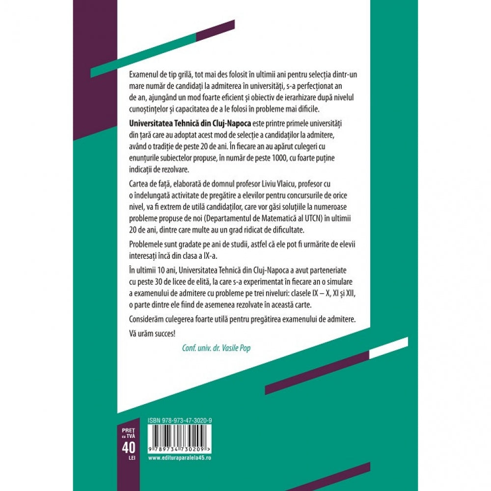 Examenul de tip grila, tot mai des folosit in ultimii ani pentru selectia dintr-un mare numar de candidati la admiterea in uni­versitati, s-a perfectionat an de an, ajungand un mod foarte eficient si obiectiv de ierarhizare dupa nivelul cunostintelor si capacitatea de a le folosi in probleme mai dificile.Universitatea Tehnica din Cluj-Napoca este printre primele universitati din tara care au adoptat acest mod de selectie a can­didatilor la admitere, avand o traditie de peste 20 de ani. In fiecare an au aparut culegeri cu enunturile subiectelor propuse, in numar de peste 1000, cu foarte putine indicatii de rezolvare.Cartea de fata, elaborata de domnul profesor Liviu Vlaicu, profesor cu o indelungata activitate de pregatire a elevilor pentru concursurile de orice nivel, va fi extrem de utila candidatilor, care vor gasi solutiile la numeroase probleme propuse de noi (Departamentul de Matematica al UTCN) in ultimii 20 de ani, dintre care multe au un grad ridicat de dificultate.Problemele sunt gradate pe ani de studii, astfel ca ele pot fi urmarite de elevii interesati inca din clasa a IX-a.In ultimii 10 ani, Universitatea Tehnica din Cluj-Napocaa avut parteneriate cu peste 30 de licee de elita, la care s-a expe­rimentat in fiecare an o simulare a examenului de admitere cu probleme pe trei niveluri: clasele IX – X, XI si XII, o parte dintre ele fiind de asemenea rezolvate in aceasta carte.Consideram culegerea foarte utila pentru pregatirea examenului de admitere.Va uram succes!Conf. univ. dr. Vasile Pop