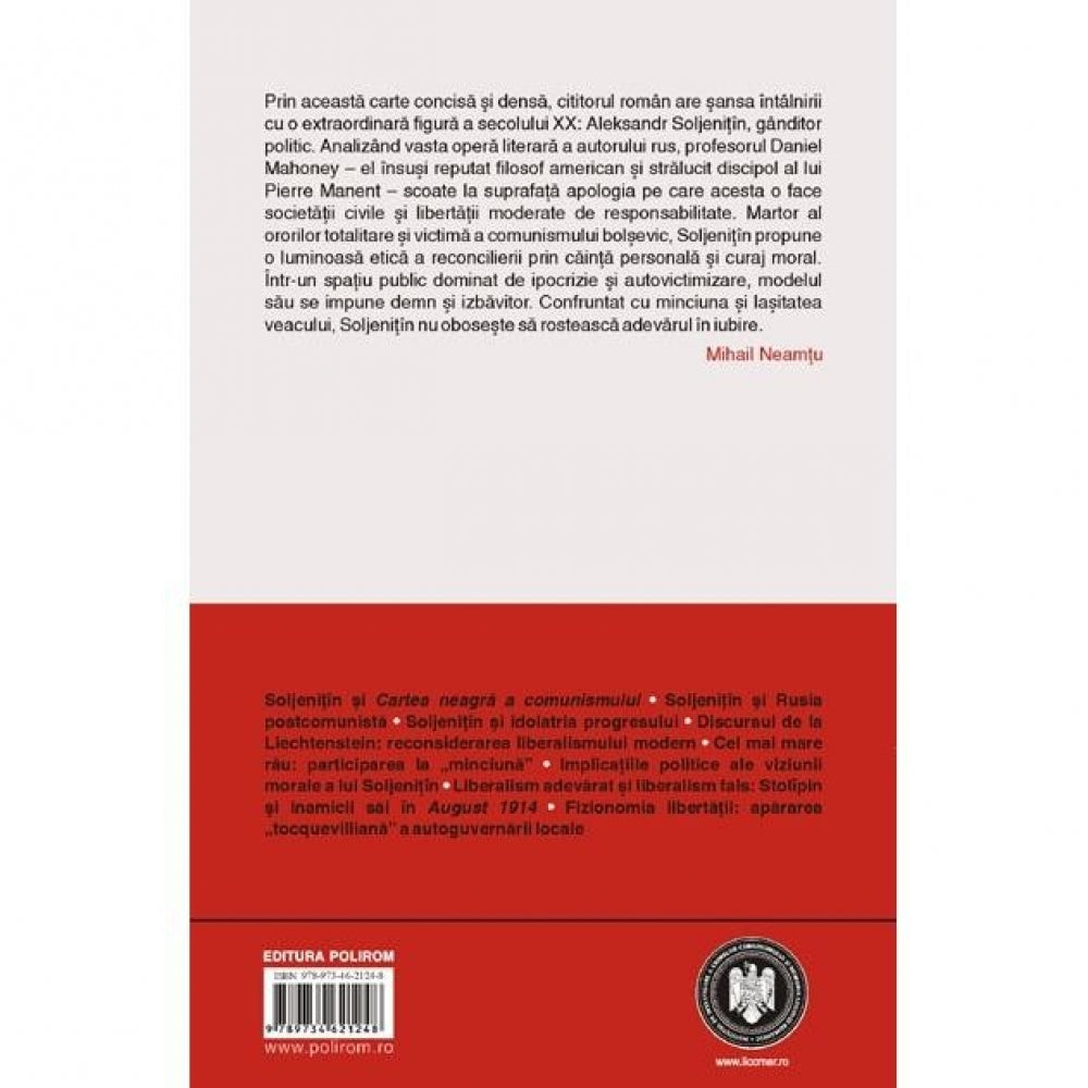 Volum aparut cu sprijinul Institutului de Investigare a Crimelor Comunismului si Memoria Exilului Romanesc Traducere de Nicolae Dragusin Daca despre Soljenitin s-a putut spune ca, sub aspectul urmarilor pe care le-a avut asupra istoriei, este scriitorul dominant al secolului XX, Daniel J. Mahoney are in vedere in cartea sa tocmai latura de disidenta politica ce ar indreptati afirmatia de mai sus. Bineinteles, autorul nu pretinde ca Soljenitin ar fi un filosof politic in sensul strict al cuvintului, dar reuseste sa-i reconstituie, in diferite etape si din diferite lucrari (unele netraduse in limba romana, precum vastul proiect Roata rosie, dedicat caderii Rusiei imperiale si nasterii Uniunii Sovietice), viziunea asupra conditiei politice a omului. Sint interesante mai ales punerea in contextul epocii a acestei viziuni si comparatiile cu figuri politice si nu numai de prim-plan, inclusiv disidenti precum Václav Havel. „Prin aceasta carte concisa si densa, cititorul roman are sansa intilnirii cu o extraordinara figura a secolului XX: Aleksandr Soljenitin, ginditor politic. Analizind vasta opera literara a autorului rus, profesorul Daniel Mahoney – el insusi reputat filosof american si stralucit discipol al lui Pierre Manent – scoate la suprafata apologia pe care acesta o face societatii civile si libertatii moderate de responsabilitate. Martor al ororilor totalitare si victima a comunismului bolsevic, Soljenitin propune o luminoasa etica a reconcilierii prin cainta personala si curaj moral. Intr-un spatiu public dominat de ipocrizie si autovictimizare, modelul sau se impune demn si izbavitor. Confruntat cu minciuna si lasitatea veacului, Soljenitin nu oboseste sa rosteasca adevarul in iubire.” (Mihail Neamtu) „O lectie despre maretia umana, o lucrare esentiala pentru a intelege tirania moderna.” (Pierre Manent) Din cuprins: Soljenitin si Cartea neagra a comunismului • Soljenitin si Rusia postcomunista • Soljenitin si idolatria progresului • Discursul de la Liechtenstein: reconsiderarea liberalismului modern • Cel mai mare rau: participarea la „minciuna” • Implicatiile politice ale viziunii morale a lui Soljenitin • Liberalism adevarat si liberalism fals: Stolipin si inamicii sai in August 1914 • Fizionomia libertatii: apararea „tocquevilliana” a autoguvernarii locale