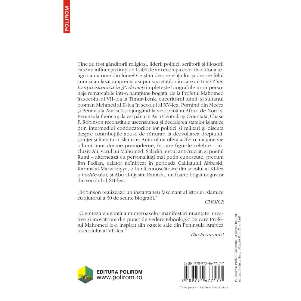 Cine au fost ginditorii religiosi, liderii politici, scriitorii si filosofii care au influentat timp de 1.400 de ani evolutia celei de-a doua religii ca marime din lume? Ce stim despre viata lor si despre felul cum si-au lasat amprenta asupra societatilor in care au trait? Civilizatia islamica in 30 de vieti impleteste biografiile unor personaje remarcabile intr-o naratiune bogata, de la Profetul Mahomed in secolul al VII-lea la Timur-Lenk, cuceritorul lumii, si sultanul otoman Mehmed al II-lea in secolul al XV-lea. Pornind din Mecca si Peninsula Arabica si ajungind la vest pina in Africa de Nord si Peninsula Iberica si la est pina in Asia Centrala si Orientala, Chase F. Robinson reconstituie ascensiunea si decaderea satelor islamice prin intermediul conducatorilor lor politici si militari si discuta despre contributiile aduse de carturari la dezvoltarea dreptului, stiintei si literaturii islamice. Autorul ne ofera astfel o imagine vie a lumii musulmane premoderne, in care figurile celebre – inclusiv ‘Ali, varul lui Mahomed, Saladin, eroul anticruciat, si poetul Rumi – alterneaza cu personalitati mai putin cunoscute, precum Ibn Fadlan, calator neinfricat in perioada Califatului Abbasid, Karima al-Marwaziyya, o buna cunoscatoare din secolul al XI-lea a hadith-ului, si Abu al-Qasim Ramisht, un foarte bogat negustor din secolul al XII-lea.