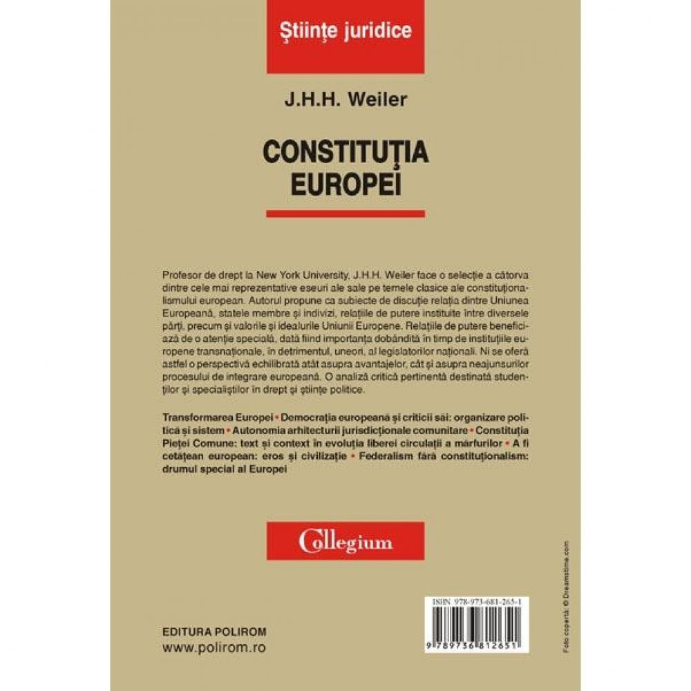 Profesor de drept la New York University, J.H.H. Weiler face o selectie a citorva dintre cele mai reprezentative eseuri ale sale pe temele clasice ale constitutionalismului european. Autorul propune ca subiecte de discutie relatia dintre Uniunea Europeana, statele membre si indivizi, relatiile de putere instituite intre diversele parti, precum si valorile si idealurile Uniunii Europene. Relatiile de putere beneficiaza de o atentie speciala, data fiind importanta dobindita in timp de institutiile europene transnationale, in detrimentul, uneori, al legislatorilor nationali. Ni se ofera astfel o perspectiva echilibrata atit asupra avantajelor, cit si asupra neajunsurilor procesului de integrare europeana. O analiza critica pertinenta destinata studentilor si specialistilor in drept si stiinte politice.