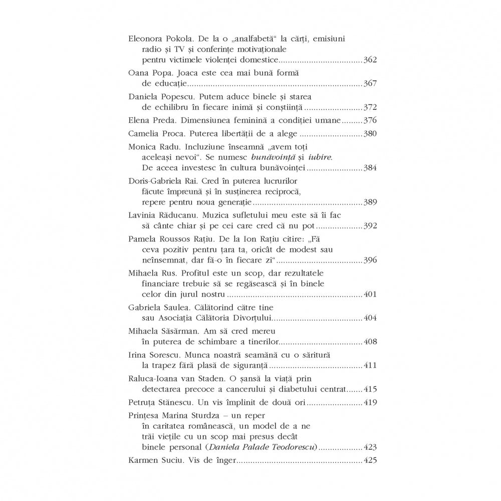 Fiecare poveste a acestor femei este un exemplu de succes obtinut prin eforturi sustinute si dorinta ferma de a realiza ceva pentru ele, pentru cei apropiati lor si, mai presus de orice, pentru comunitate. Aceste doamne activeaza in domenii variate si sustin proiecte dintre cele mai diverse, dar la baza tuturor marturiilor stau aceleasi notiuni de curaj, pasiune, generozitate, iubire, putere.