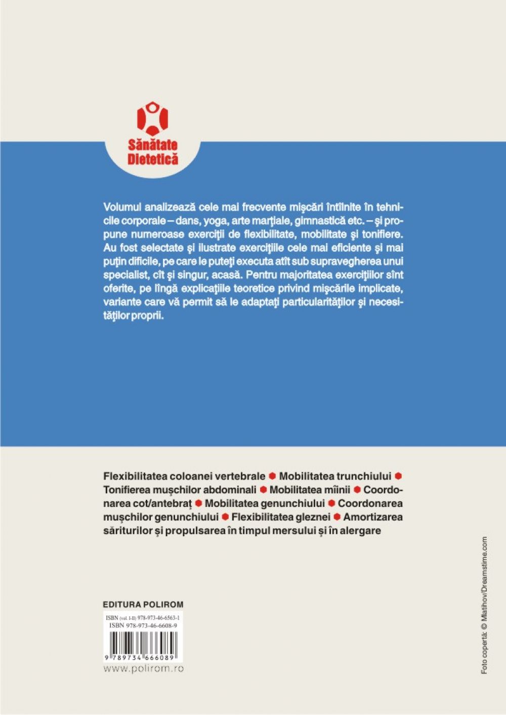 Volumul analizeaza cele mai frecvente miscari întîlnite în tehnicile corporale – dans, yoga, arte martiale, gimnastica etc. – si propune numeroase exercitii de flexibilitate, mobilitate si tonifiere. Au fost selectate si ilustrate exercitiile cele mai eficiente si mai putin dificile, pe care le puteti executa atît sub supravegherea unui specialist, cît si singur, acasa. Pentru majoritatea exercitiilor sînt oferite, pe lînga explicatiile teoretice privind miscarile implicate, variante care va permit sa le adaptati particularitatilor si necesitatilor proprii.