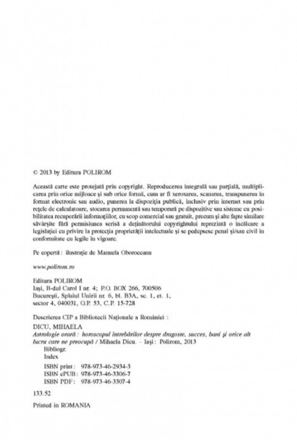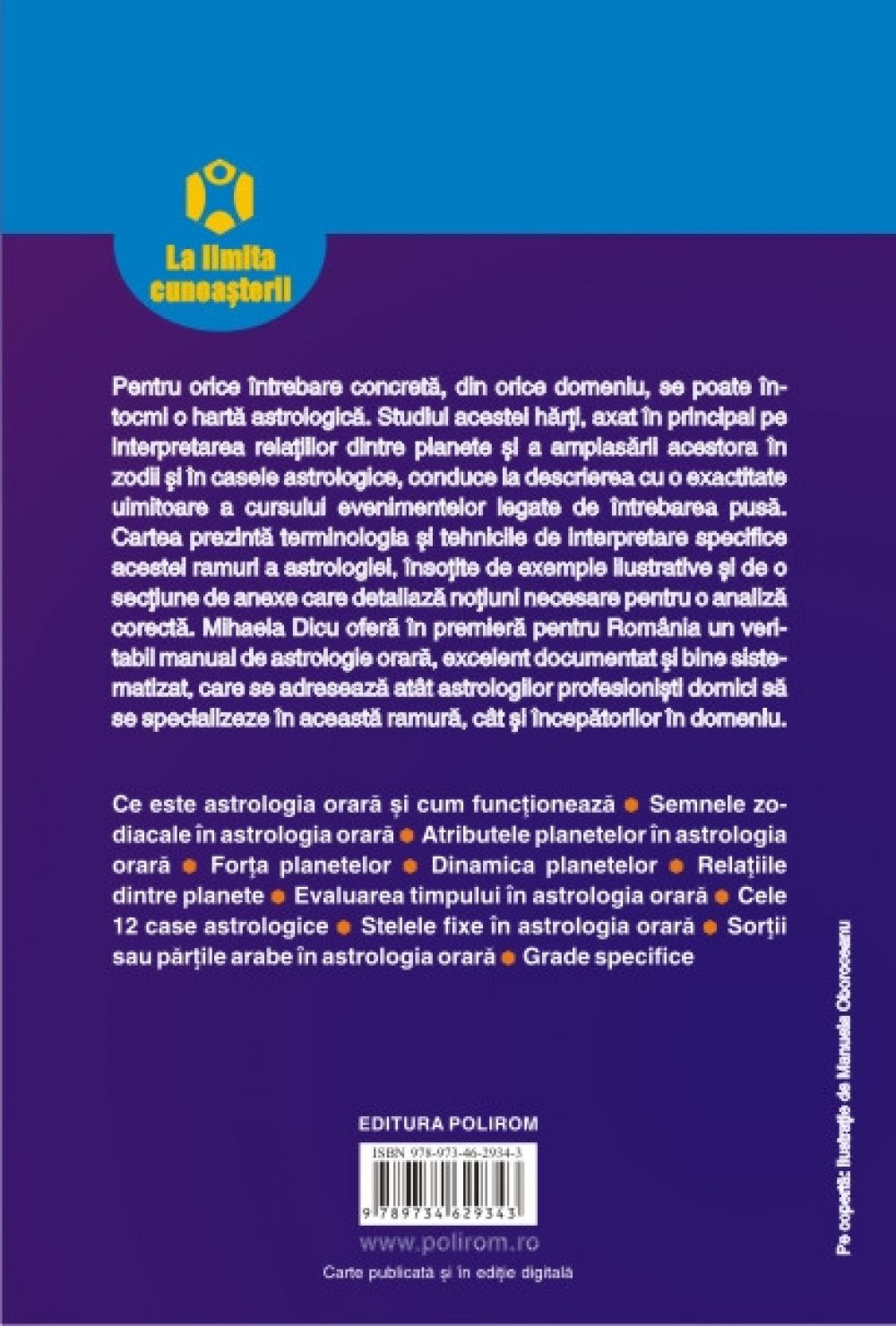 Pentru orice intrebare concreta, din orice domeniu, se poate intocmi o harta astrologica. Studiul acestei harti, axat in principal pe interpretarea relatiilor dintre planete si a amplasarii acestora in zodii si in casele astrologice, conduce la descrierea cu o exactitate uimitoare a cursului evenimentelor legate de intrebarea pusa. Cartea prezinta terminologia si tehnicile de interpretare specifice acestei ramuri a astrologiei, insotite de exemple ilustrative si de o sectiune de anexe care detaliaza notiuni necesare pentru o analiza corecta. Mihaela Dicu ofera in premiera pentru Romania un veritabil manual de astrologie orara, excelent documentat si bine sistematizat, care se adreseaza atit astrologilor profesionisti dornici sa se specializeze in aceasta ramura, cit si incepatorilor in domeniu.