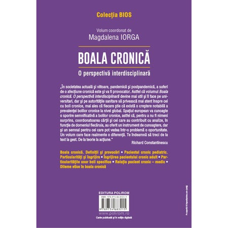 „In societatea actuala si viitoare, pandemica si postpandemica, a suferi de o afectiune cronica este si va fi provocator. Astfel ca volumul Boala cronica. O perspectiva interdisciplinara devine mai util si ii face pe universitari, dar si pe autoritatile sanitare sa priveasca mai atent inspre cei cu boli cronice, mai ales ca fiecare stie ca exista o crestere notabila a prevalentei bolilor cronice la nivel global. Spatiul european va cunoaste o sporire semnificativa a bolilor cronice, astfel ca, pentru a nu fi nimeni surprins, coordonatoarea cartii si cei care au contribuit cu analize, in functie de domeniul fiecaruia, au oferit un instrument de cunoastere, dar si un semnal pentru cei care pot vedea intr-o problema o oportunitate. Un volum care face realmente o diferenta. Te indeamna sa treci de la text la gest. De la teorie la actiune.” (Richard Constantinescu)