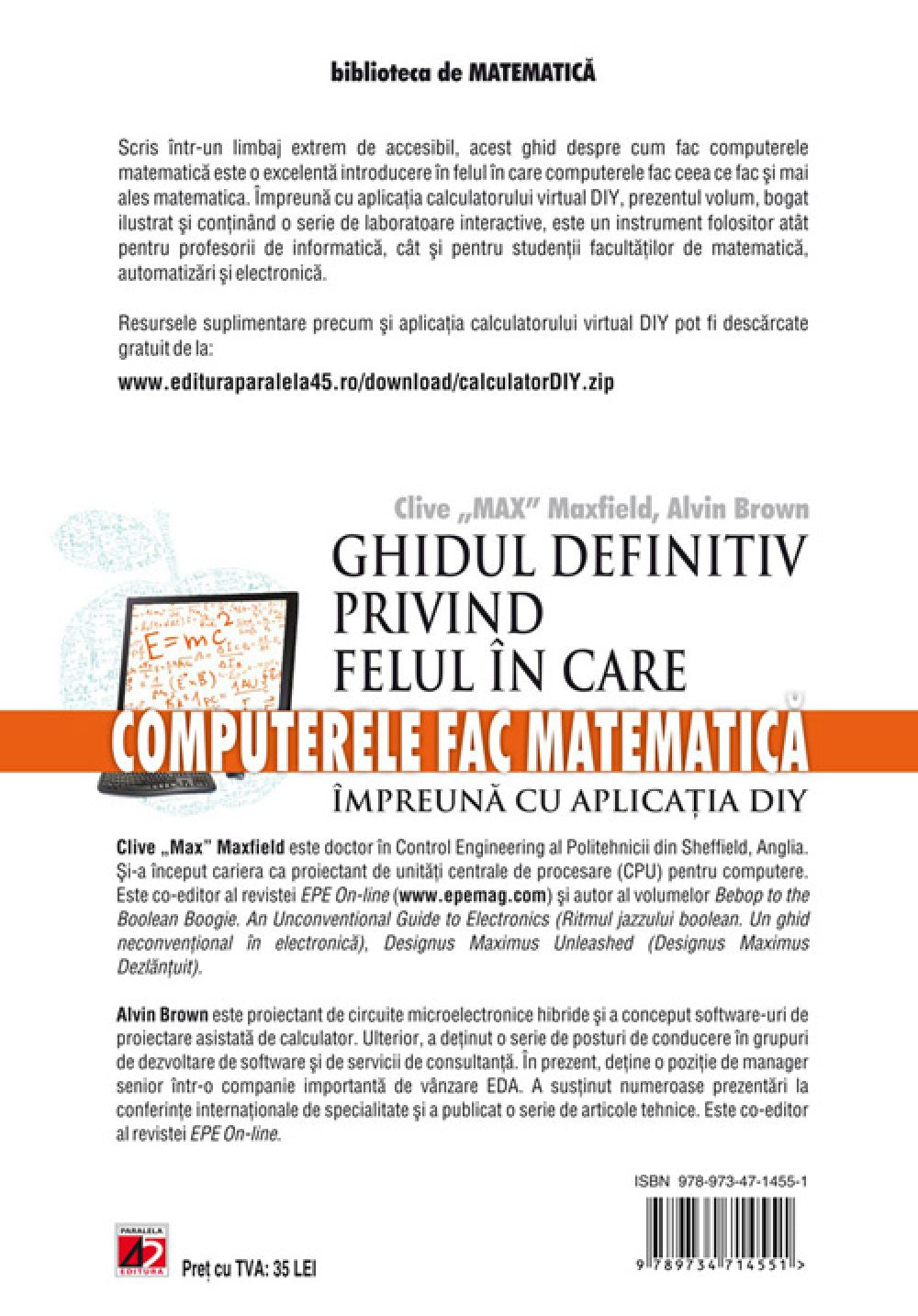 Scris intr-un limbaj extrem de accesibil, acest ghid despre cum fac computerele matematica este o excelenta introducere in felul in care computerele fac ceea ce fac si mai ales matematica. Impreuna cu aplicatia calculatorului virtual DIY, prezentul volum, bogat ilustrat si continand o serie de laboratoare interactive, este un instrument folositor atat pentru profesorii de informatica, cat si pentru studentii facultatilor de matematica, automatizari si electronica.