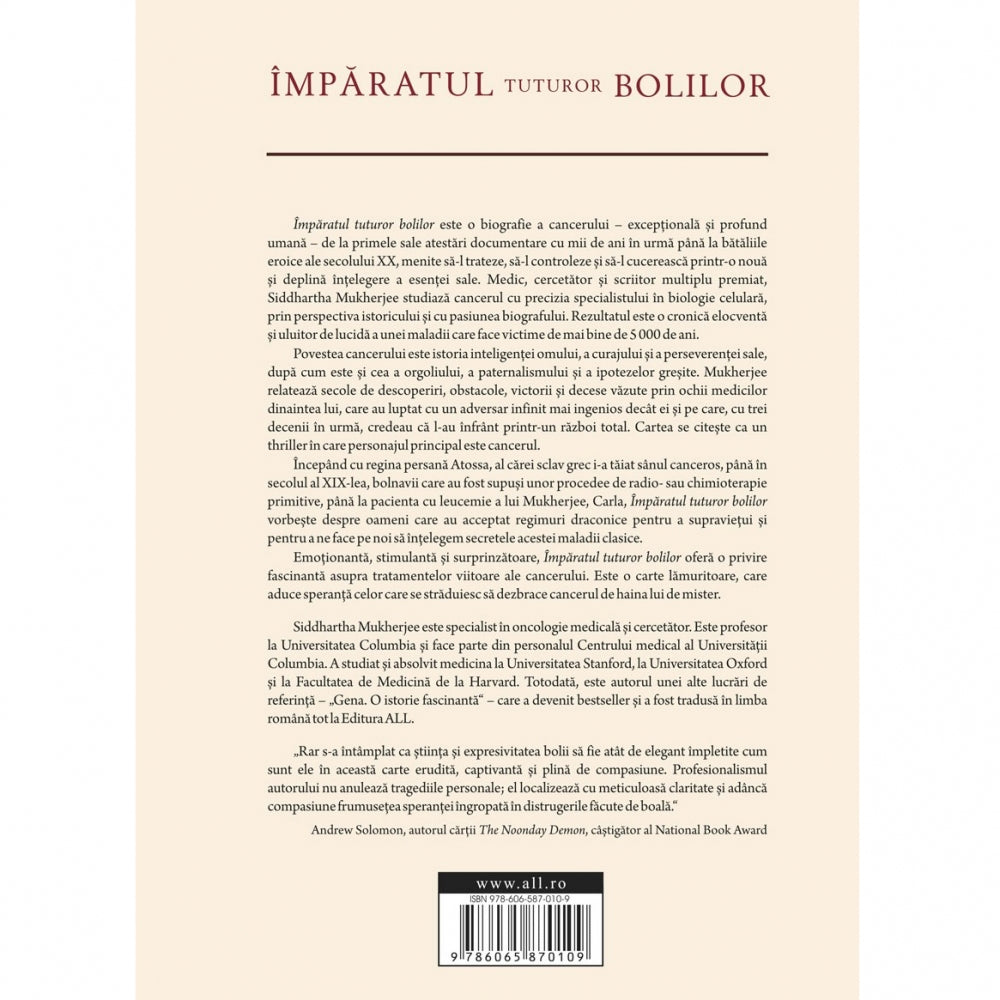 Emotionanta, stimulanta si surprinzatoare, Imparatul tuturor bolilor ofera o privire fascinanta asupra tratamentelor viitoare ale cancerului. Este o carte lamuritoare, care aduce speranta celor care se straduiesc sa dezbrace cancerul de haina lui de mister.