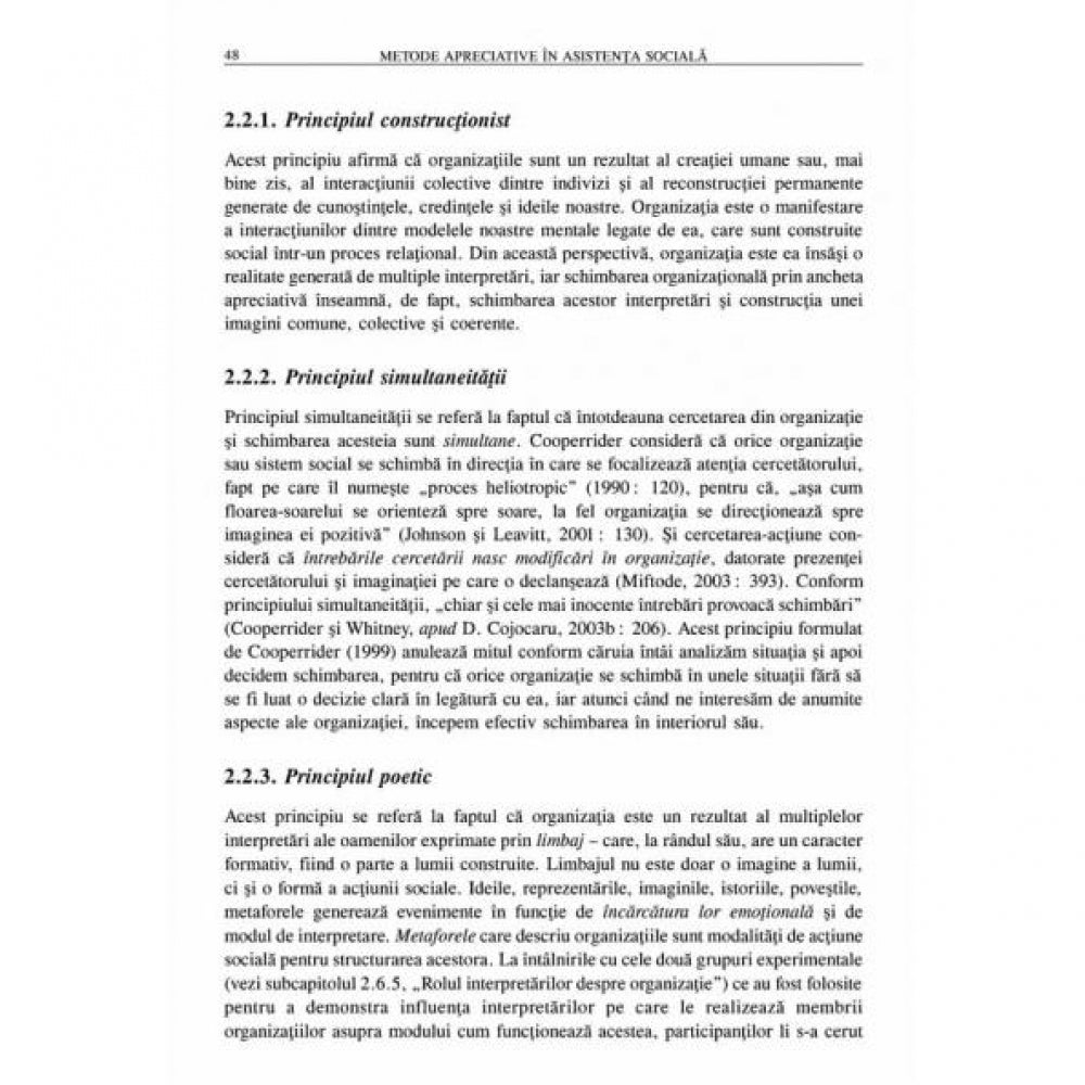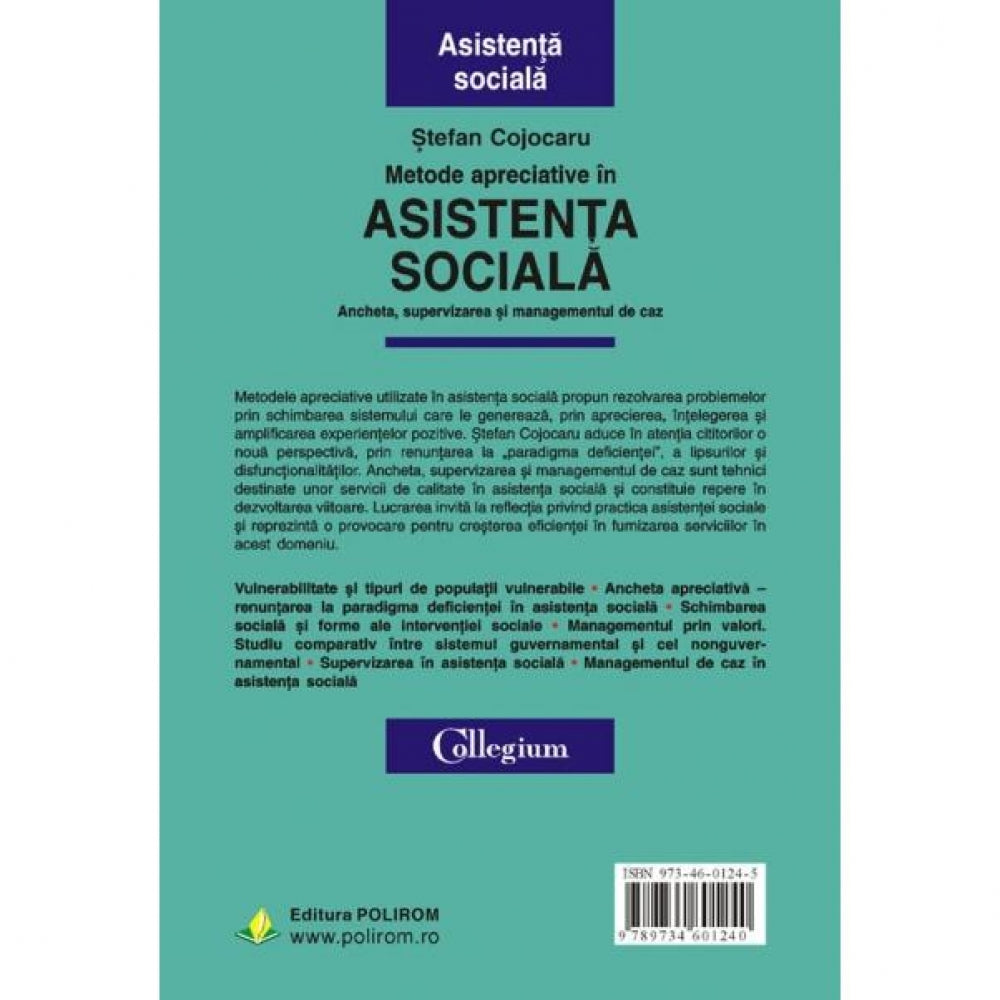 Metodele apreciative utilizate in asistenta sociala propun rezolvarea problemelor prin schimbarea sistemului care le genereaza, prin aprecierea, intelegerea si amplificarea experientelor pozitive. Ancheta, supervizarea si managementul de caz sint tehnici destinate unor servicii de calitate in asistenta sociala si constituie repere in dezvoltarea viitoare. Lucrarea invita la reflectia privind practica asistentei sociale si reprezinta o provocare pentru cresterea eficientei in furnizarea serviciilor in acest domeniu.