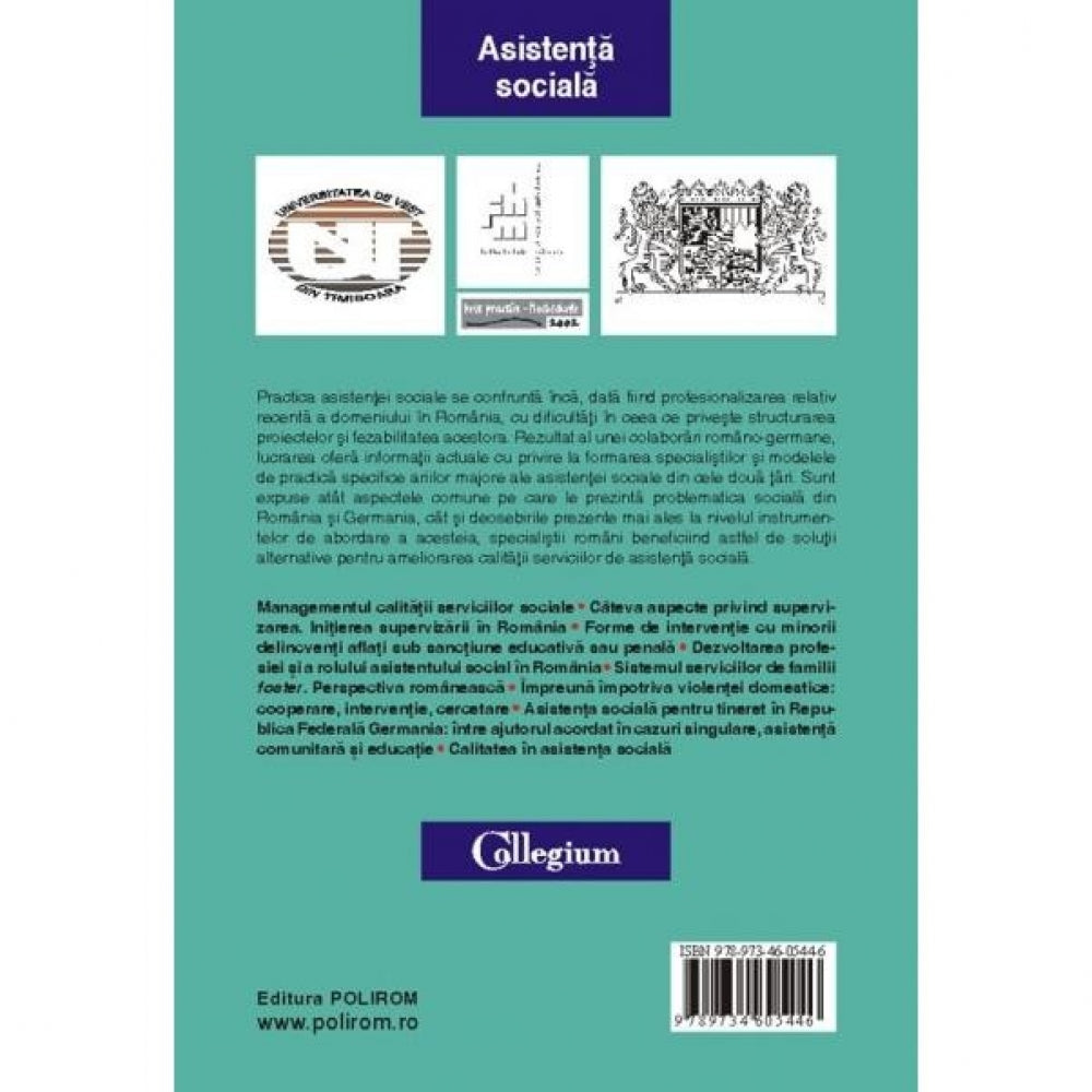 Practica asistentei sociale se confrunta inca, data fiind profesionalizarea relativ recenta a domeniului in Romania, cu dificultati in ceea ce priveste structurarea proiectelor si fezabilitatea acestora. Rezultat al unei colaborari romano-germane, lucrarea ofera informatii actuale cu privire la formarea specialistilor si modelele de practica specifice ariilor majore ale asistentei sociale din cele doua tari. Sunt expuse atat aspectele comune pe care le prezinta problematica sociala din Romania si Germania, cat si deosebirile prezente mai ales la nivelul instrumentelor de abordare a acesteia, specialistii romani beneficiind astfel de solutii alternative pentru ameliorarea calitatii serviciilor de asistenta sociala.