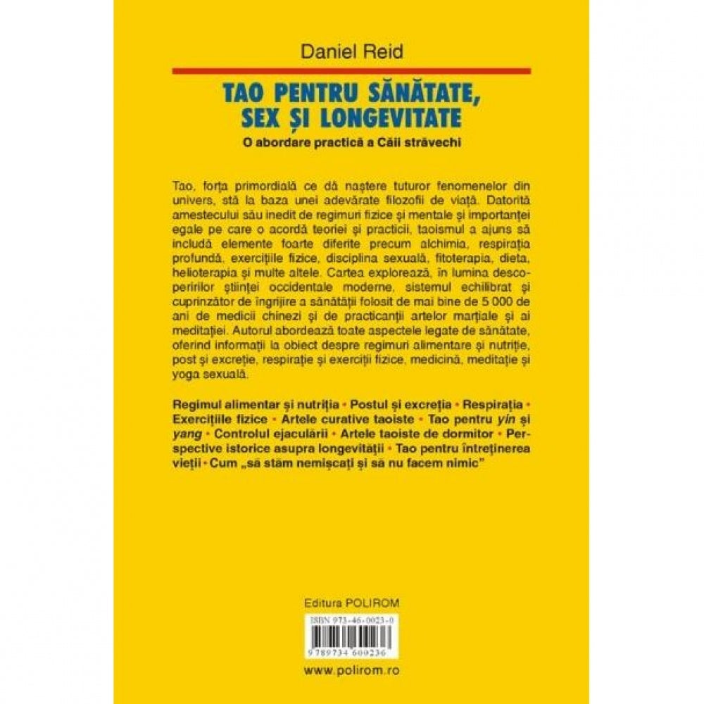 Tao, forta primordiala ce da nastere tuturor fenomenelor din univers, sta la baza unei adevarate filosofii de viata. Datorita amestecului sau inedit de regimuri fizice si mentale si importantei egale pe care o acorda teoriei si practicii, taoismul a ajuns sa includa elemente foarte diferite precum alchimia, respiratia profunda, exercitiile fizice, disciplina sexuala, fitoterapia, dieta, helioterapia si multe altele. Cartea exploreaza, in lumina descoperirilor stiintei occidentale moderne, sistemul echilibrat si cuprinzator de ingrijire a sanatatii folosit de mai bine de 5 000 de ani de medicii chinezi si de practicantii artelor martiale si ai meditatiei. Autorul abordeaza toate aspectele legate de sanatate, oferind informatii la obiect despre regimuri alimentare si nutritie, post si excretie, respiratie si exercitii fizice, medicina, meditatie si yoga sexuala.